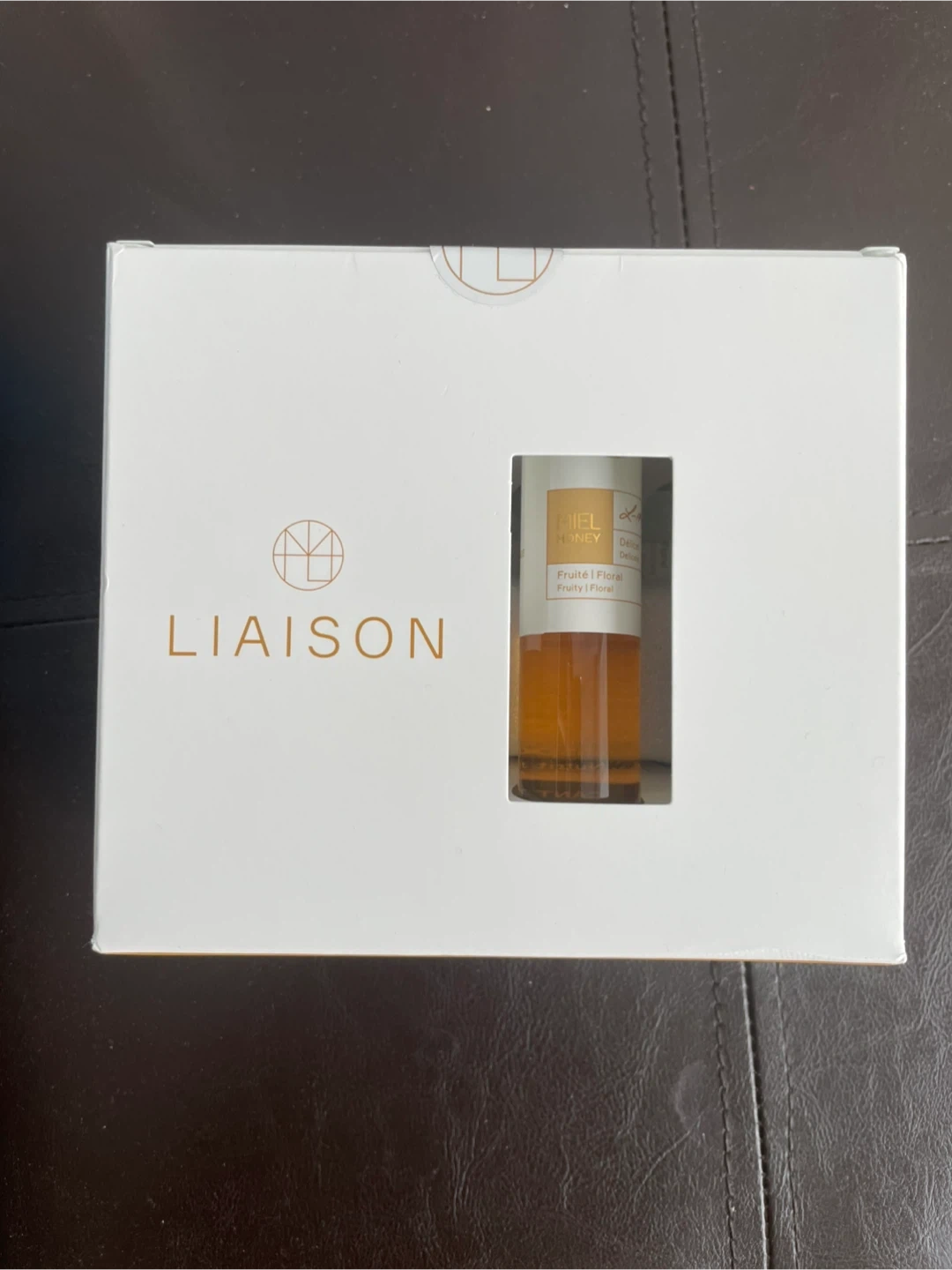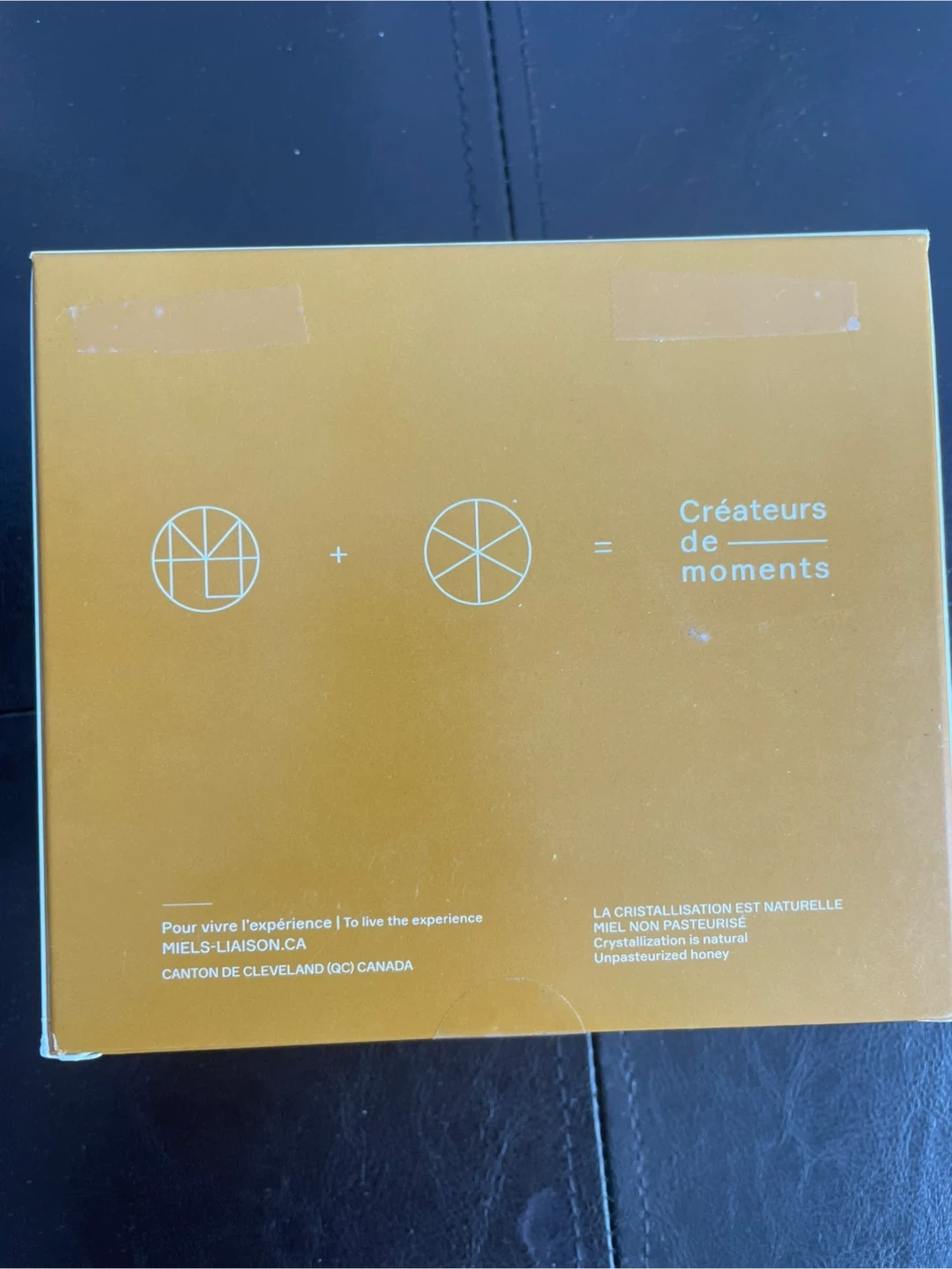 Selling a Liaison Ensemble Dégustation Tasting Set. This set includes a wooden display and a selection of honey. The box states "A link between two worlds is about to be created."