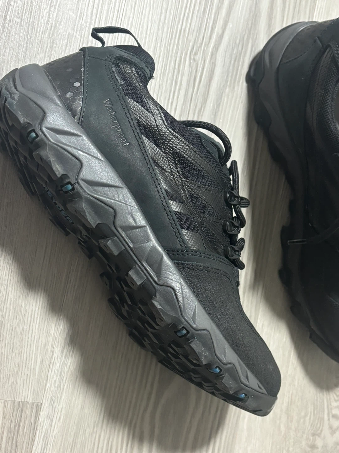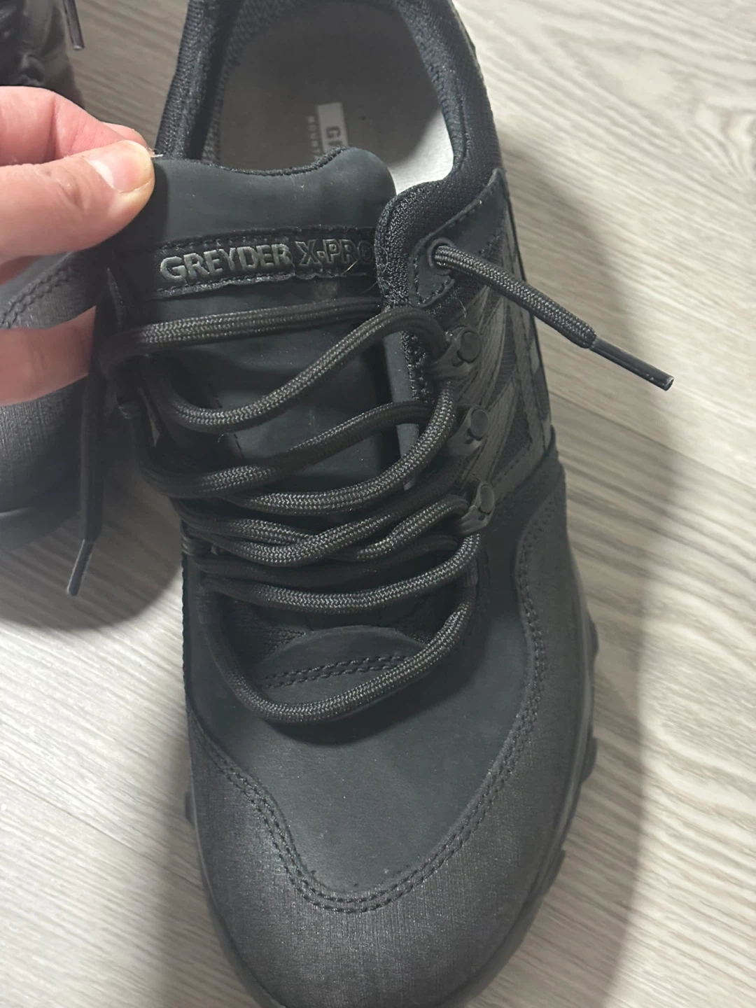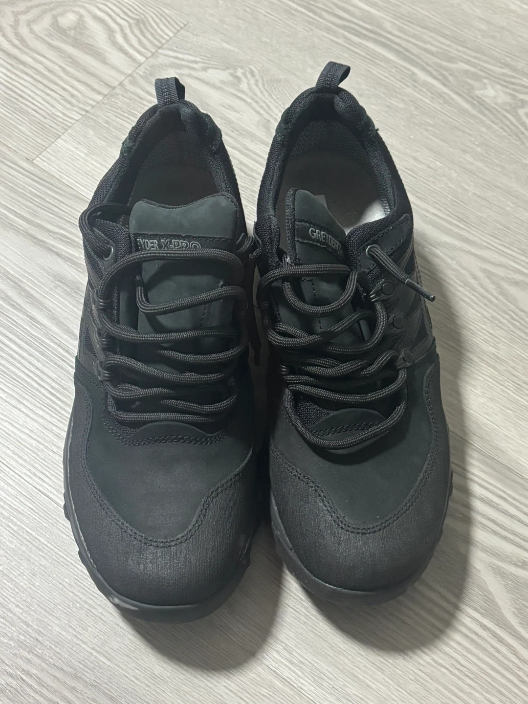 These GREYDER "X-PRO" Mountain Athletics shoes are black and waterproof. They feature a rugged sole for traction. They're great for trails and outdoor adventures!