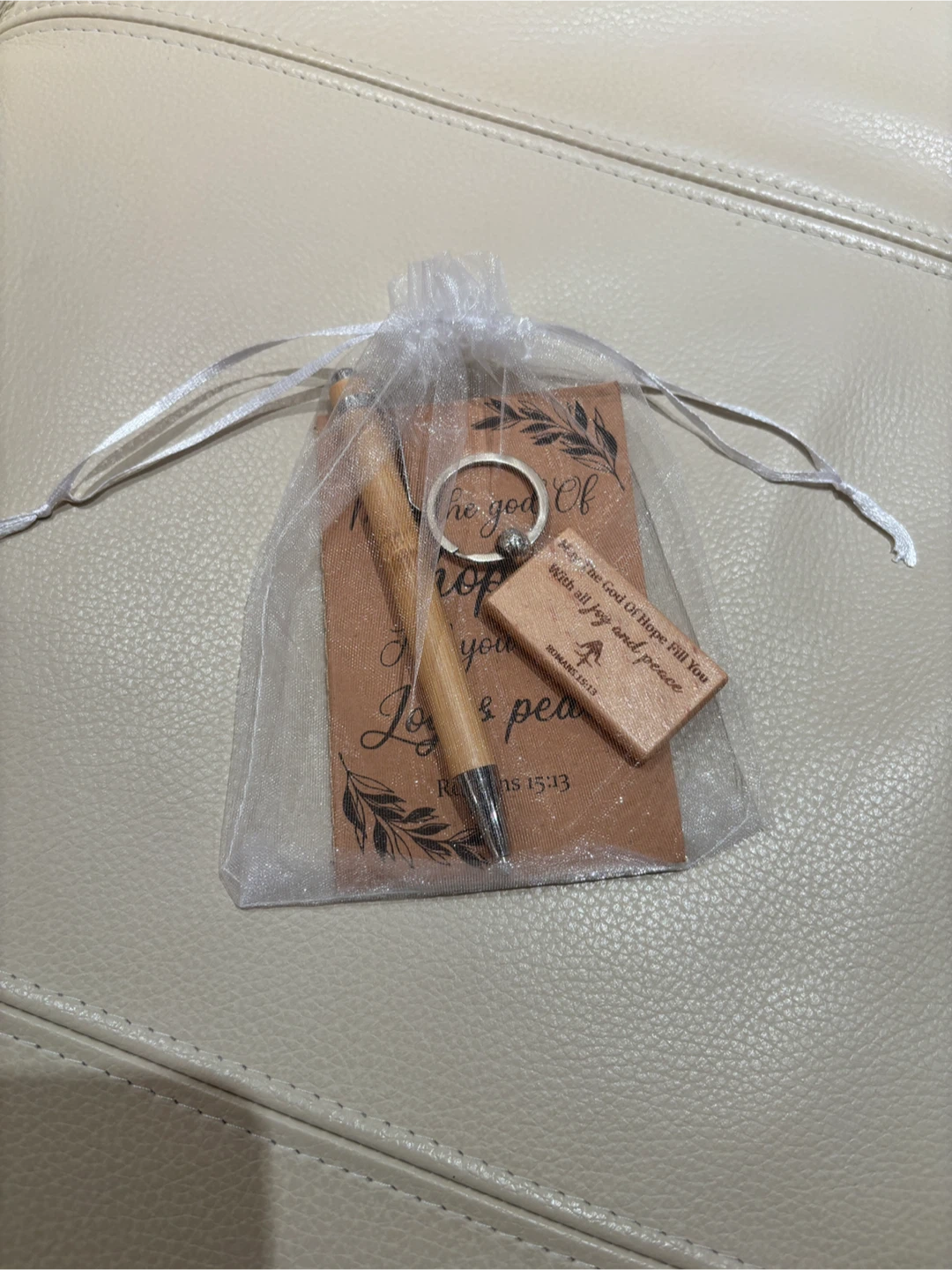 This is a lovely set that includes a wooden pen, a keychain, and a small notebook. The keychain and card both feature the message "May the God of hope fill you with all joy and peace. Romans 15:13". It comes in a small bag, perfect for gifting!