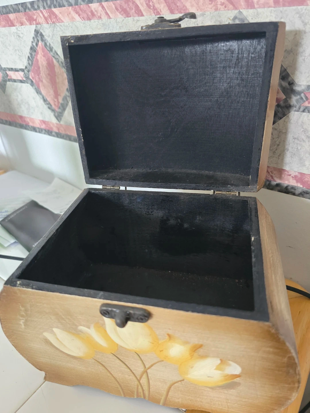 This wooden box features a charming hand-painted design of yellow tulips on the front. It's perfect for storing small treasures like jewellery or keepsakes.