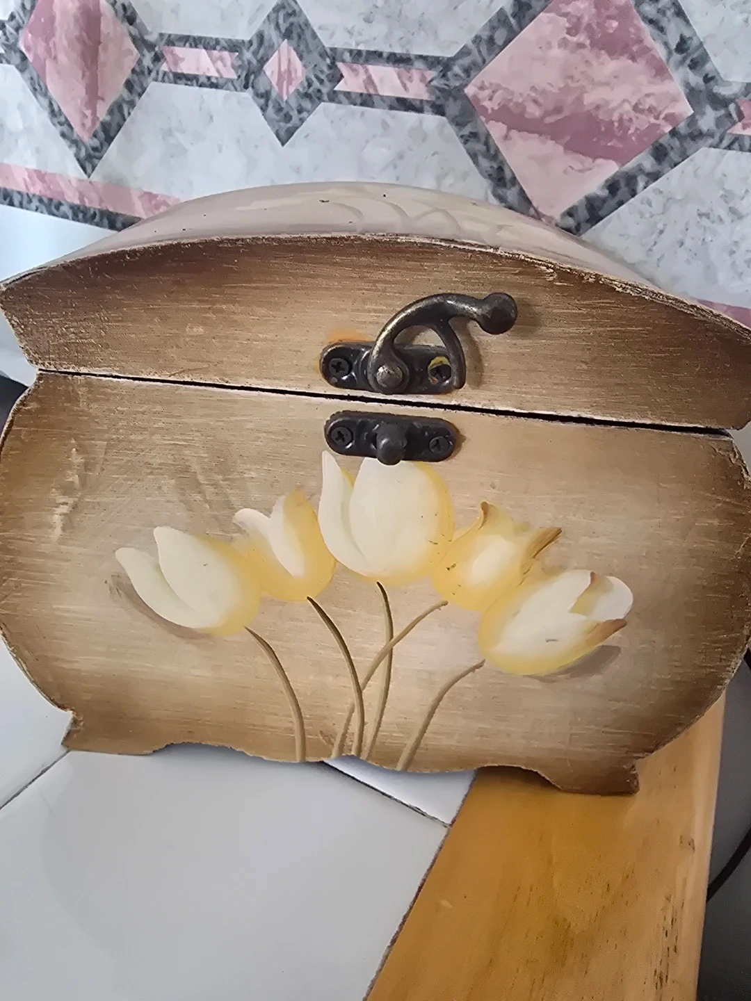 This wooden box features a charming hand-painted design of yellow tulips on the front. It's perfect for storing small treasures like jewellery or keepsakes.
