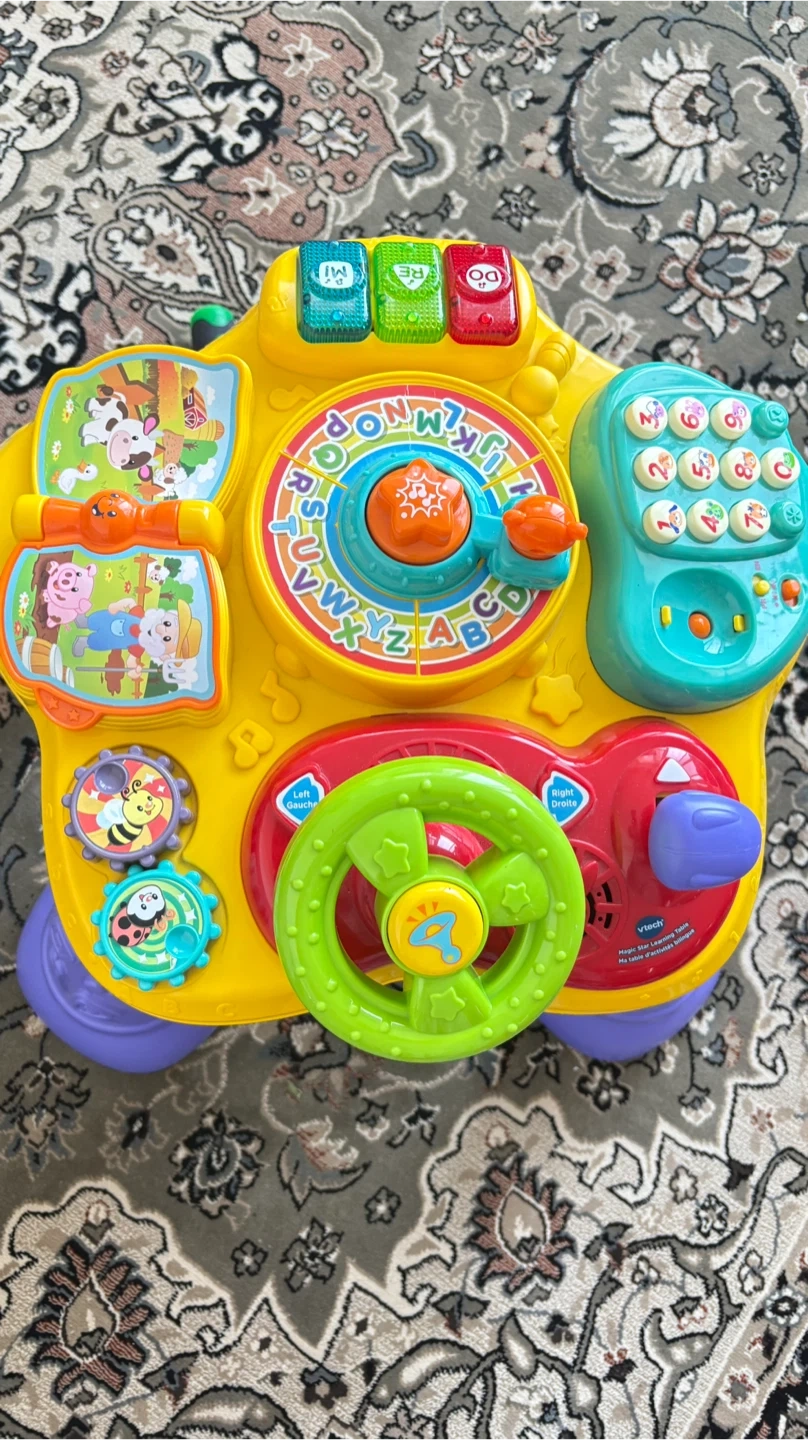 This VTech Smart Study Desk is loaded with fun learning activities! It features a steering wheel, piano keys, and a phone. It's great for little ones learning their ABCs and numbers. Made of durable plastic.