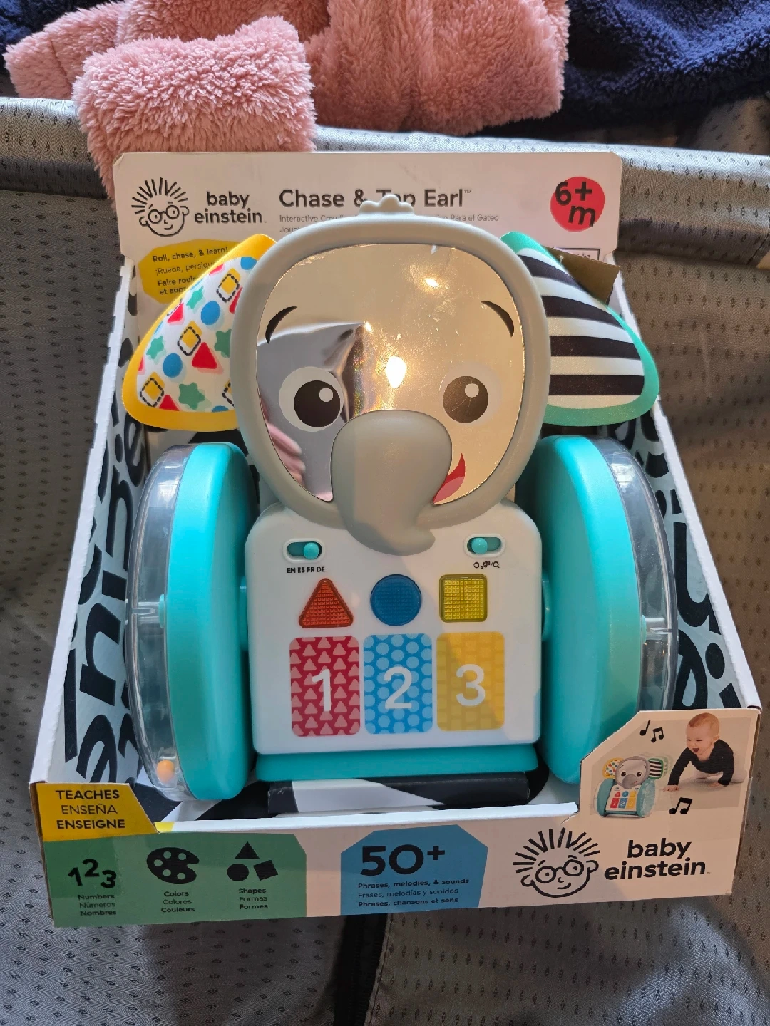 Selling a Baby Einstein Chase & Tap Earl interactive toy, perfect for little ones aged 6 months and up! It rolls, chases, and teaches numbers, colours, and shapes. It also has 50+ phrases, melodies and sounds to keep your little one entertained