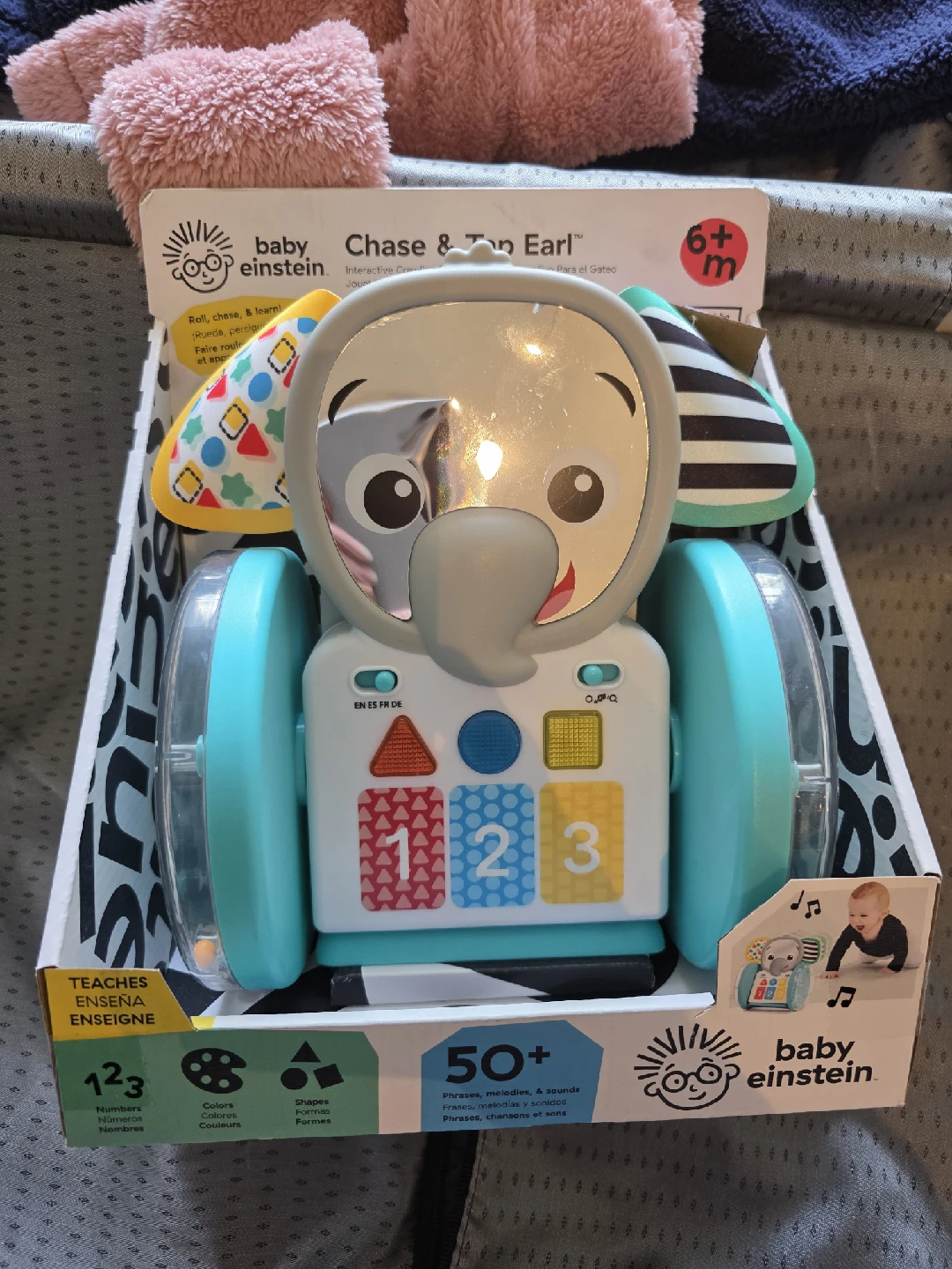 Selling a Baby Einstein Chase & Tap Earl interactive toy, perfect for little ones aged 6 months and up! It rolls, chases, and teaches numbers, colours, and shapes. It also has 50+ phrases, melodies and sounds to keep your little one entertained