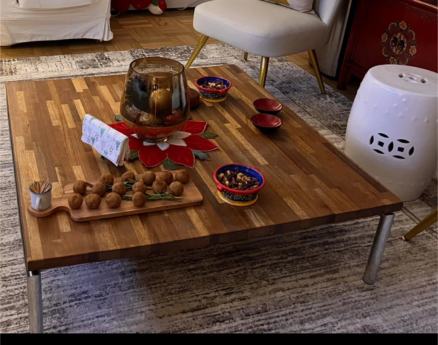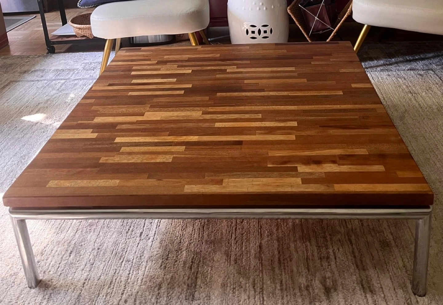 Selling this lovely solid wood coffee table, perfect for adding warmth and charm to your living space. The table features a unique mixed-wood pattern top and has been gently used and well cared for. It’s sturdy, stylish, and ready for a new home!
