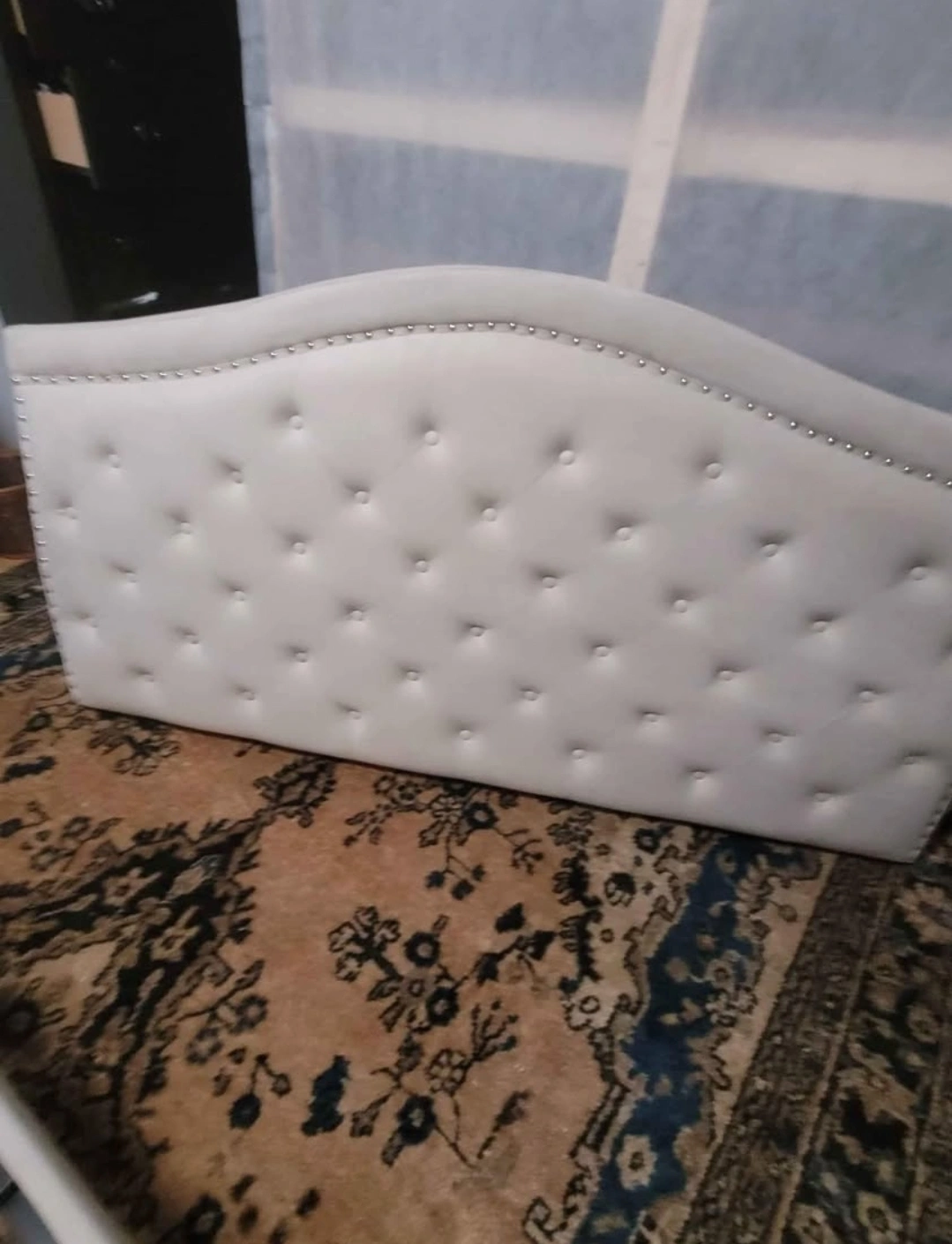 Beige fabric bed frame. Queen size. Includes headboard and slatted base. Button-tufted headboard. Silver nailhead trim. Minimal assembly required.