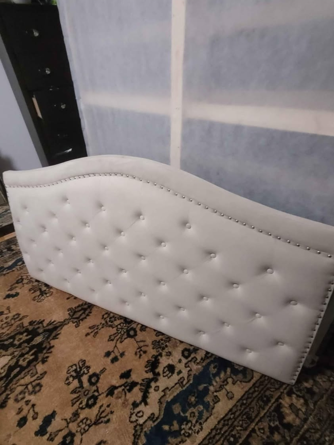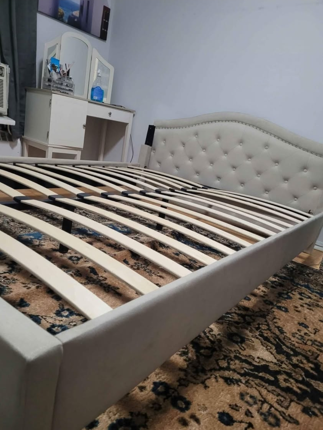 Beige fabric bed frame. Queen size. Includes headboard and slatted base. Button-tufted headboard. Silver nailhead trim. Minimal assembly required.
