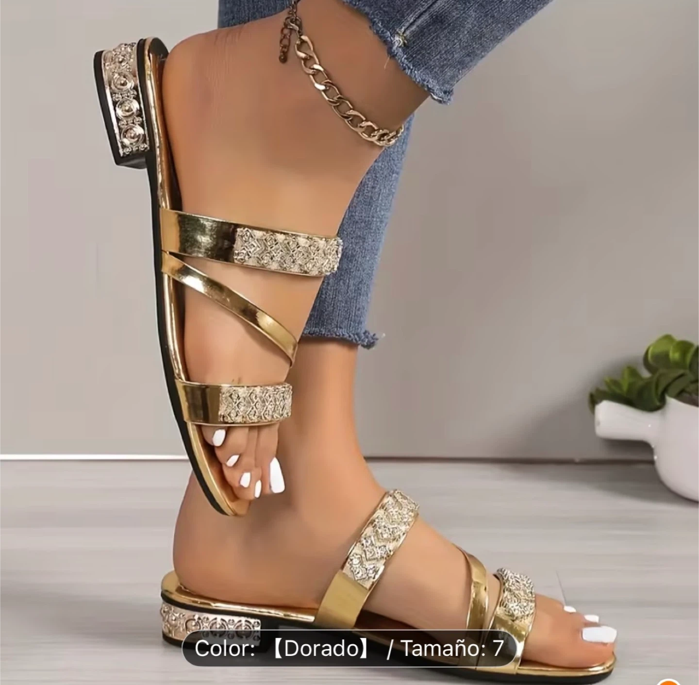 These dazzling gold slide sandals feature a comfortable low heel and sparkling rhinestone embellishments on the straps. The shiny metallic finish makes them a stylish choice for any occasion. Size 7.