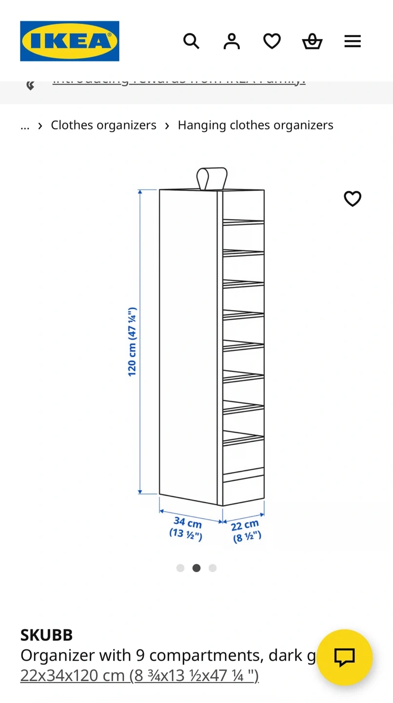 Keep your closet tidy with this handy IKEA SKUBB hanging organizer! It features 9 compartments to help you store clothes, shoes, or accessories. Dimensions are 22x34x120 cm). Made from 100% polyester, it's lightweight and easy to hang.