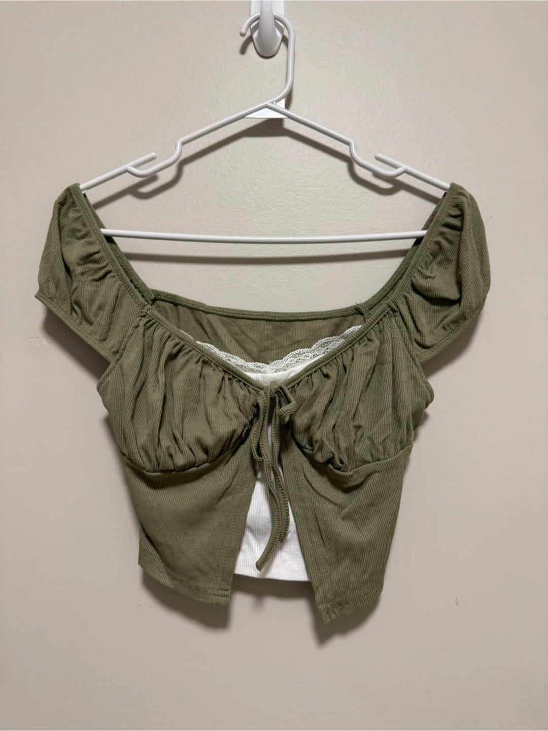 Cute olive green crop top with a tie-front detail! It's in great condition and has a lovely lace trim. Perfect for a casual day out or dressing up for a night with friends