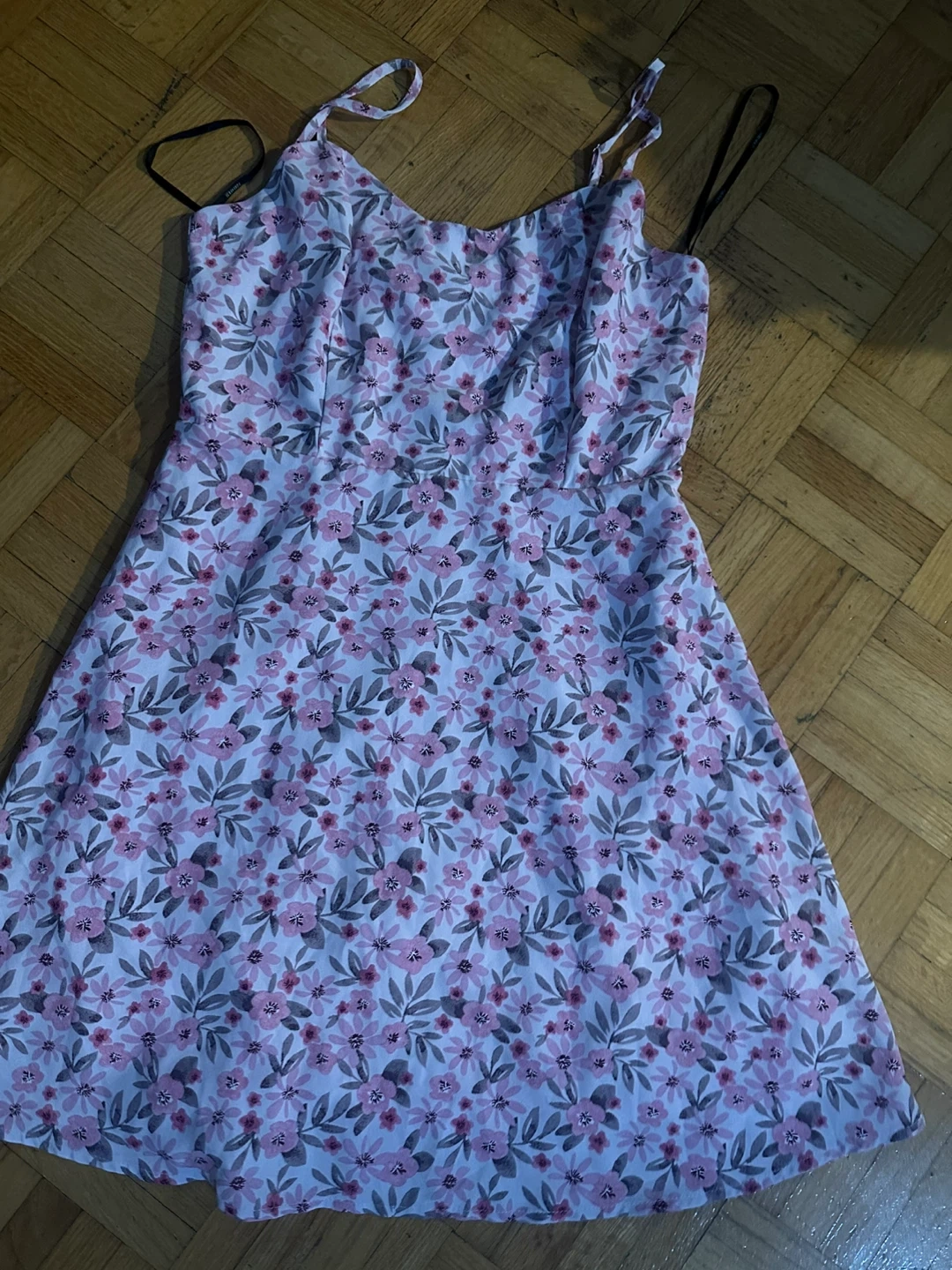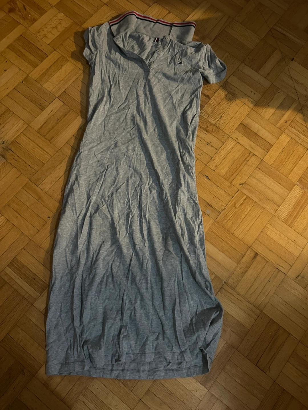 A collection of four dresses featuring various styles. Includes a pink floral print dress, a yellow crinkled maxi skirt-style dress, a grey polo dress, and a black and white plaid mini dress. Also a navy and white striped t-shirt dress with "Hilfiger" embroidery. Mostly size medium. Material is soft cotton blend. Perfect for casual wear!