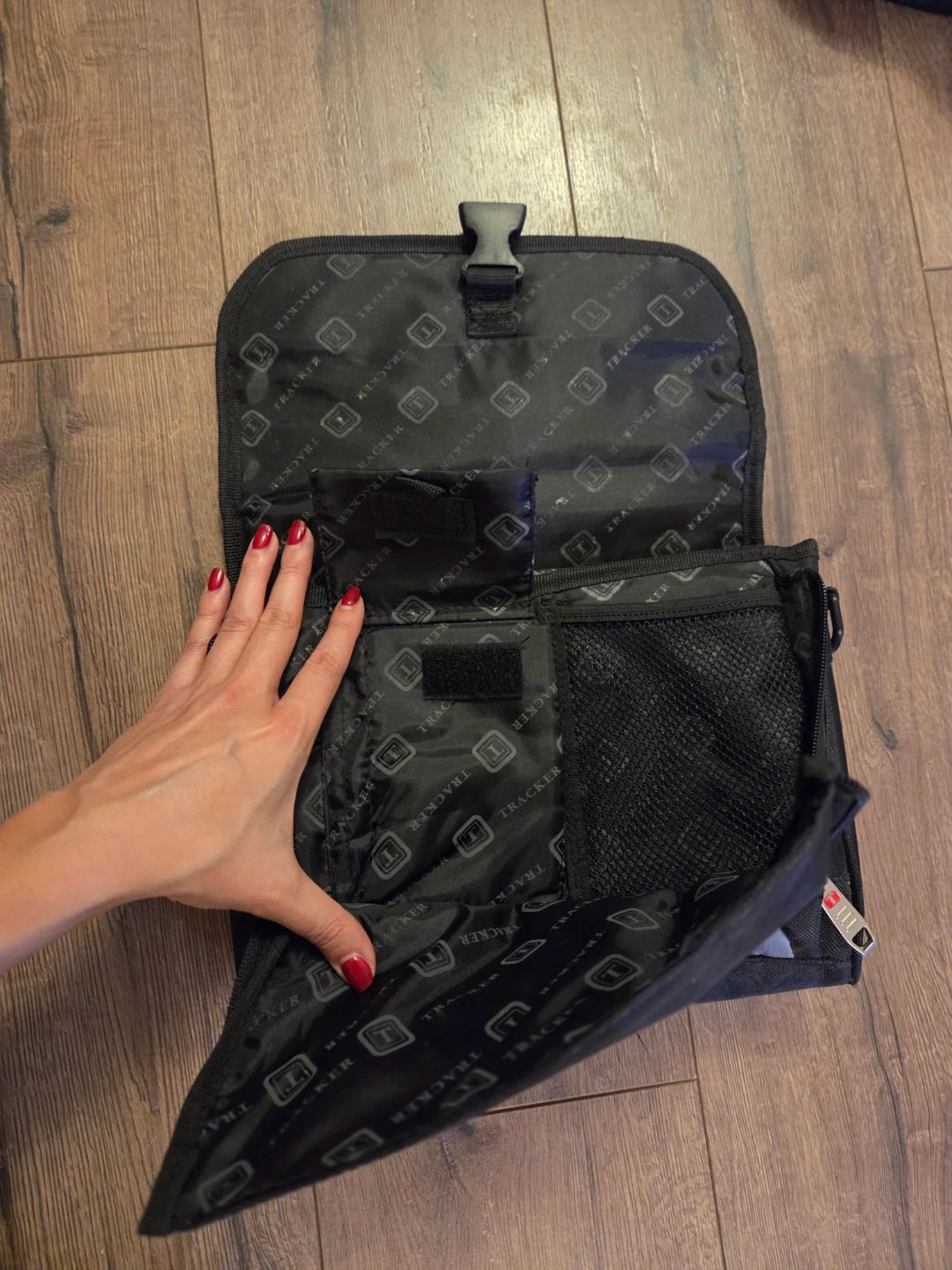 Selling a small Tracker bag in black and grey. It's in great condition and perfect for travel, tablets, ipads or organizing your toiletries, etc. The bag has multiple compartments and a convenient handle for easy carrying.