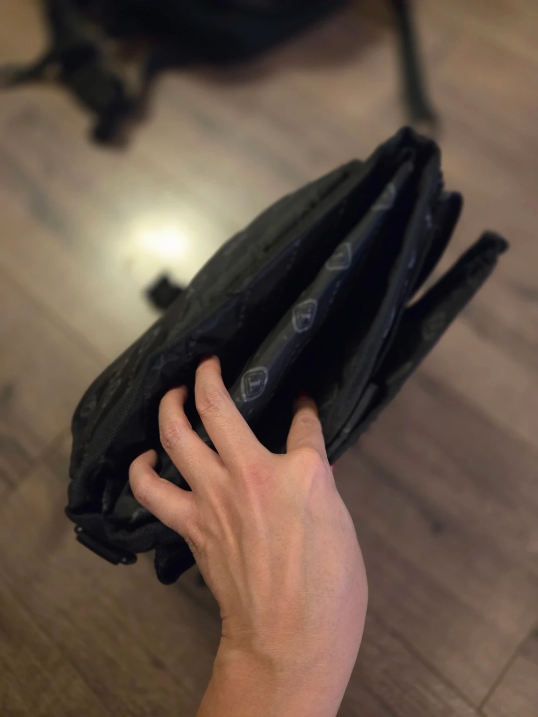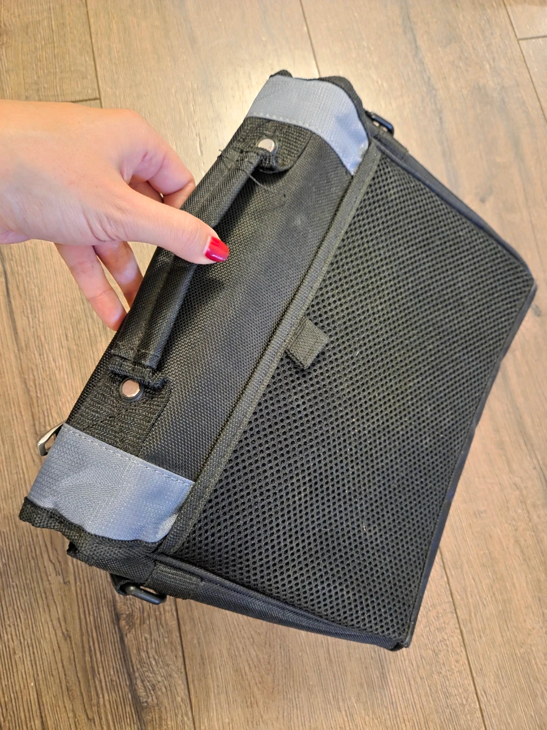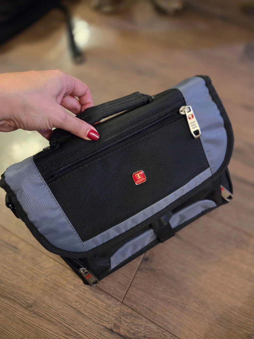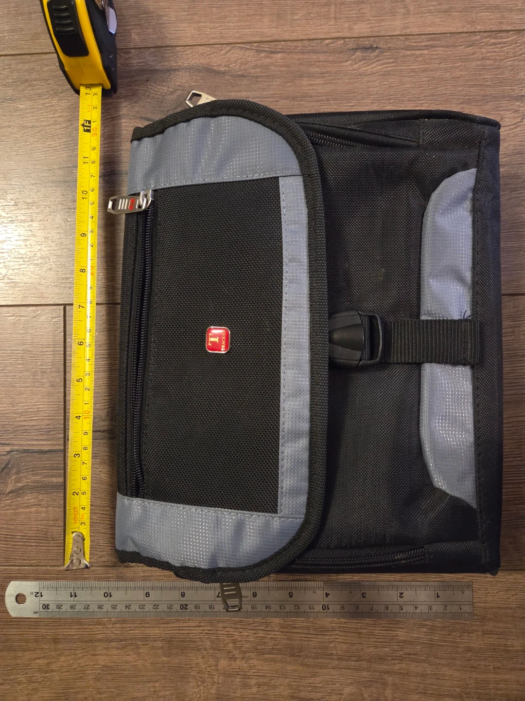 Selling a small Tracker bag in black and grey. It's in great condition and perfect for travel, tablets, ipads or organizing your toiletries, etc. The bag has multiple compartments and a convenient handle for easy carrying.
