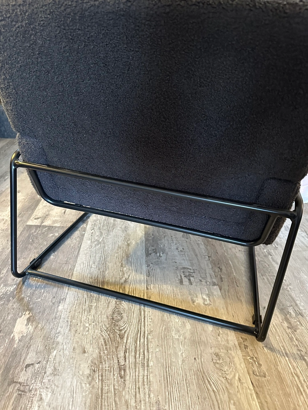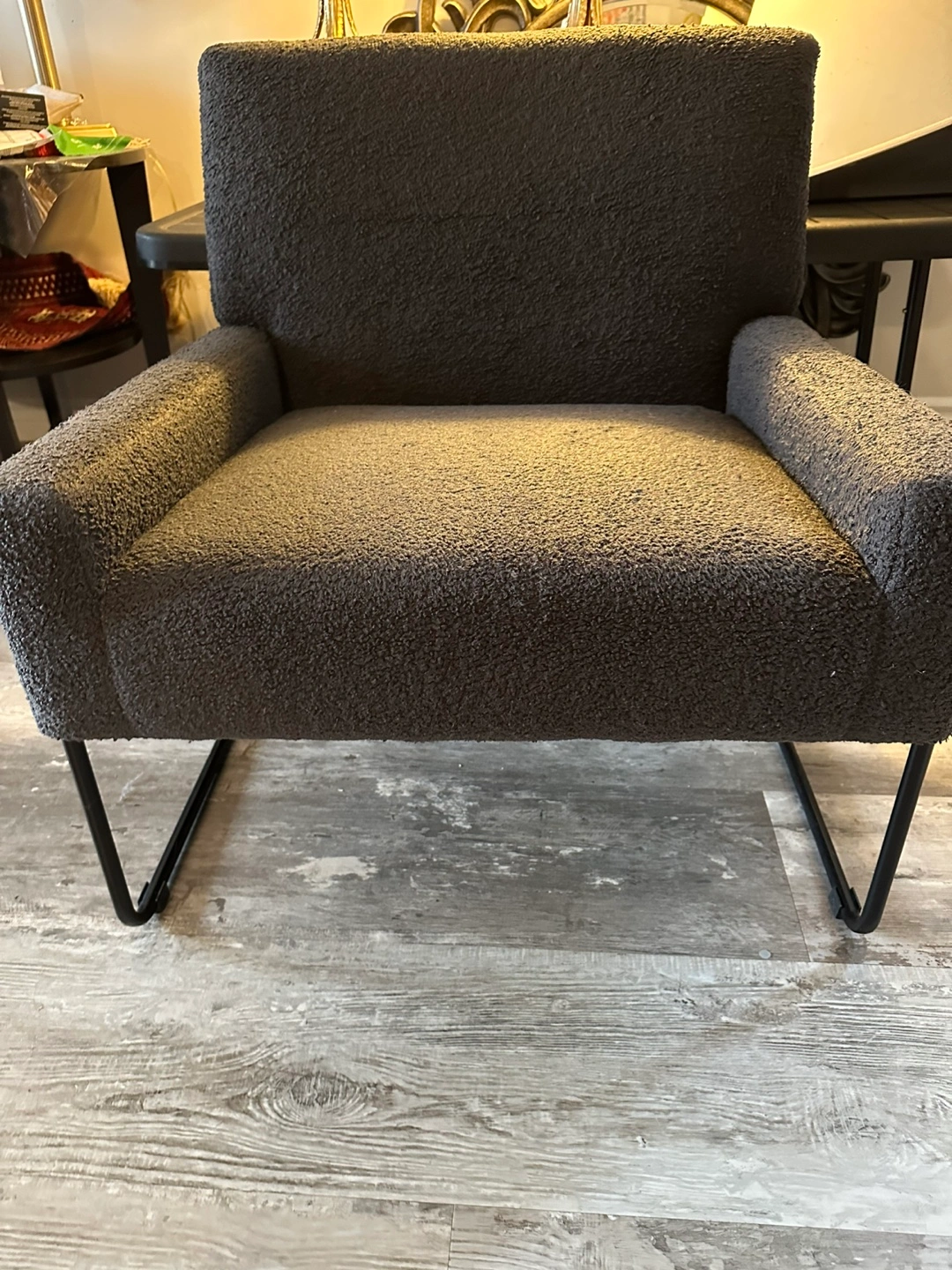 This is a plush, soft armchair. The chair has a grey fabric upholstery. The frame of the chair is made of metal and has black legs.