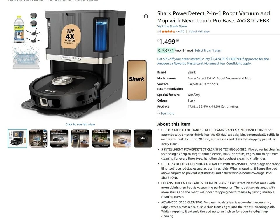 Basically new (open box) Shark PowerDetect 2-in-1 Robot Vacuum and Mop, Model: AV2810ZEBK. Powerful whole-home cleaning. NeverTouch™ Pro Base self-empties, self-refills, and self-cleans for up to 30 days of hands-free cleaning. NeverStuck Technology™ helps avoid stuck scenarios. 360 LiDAR and 3D sensors detect and avoid objects. Cash Preferred. Meet up in Woodbridge.