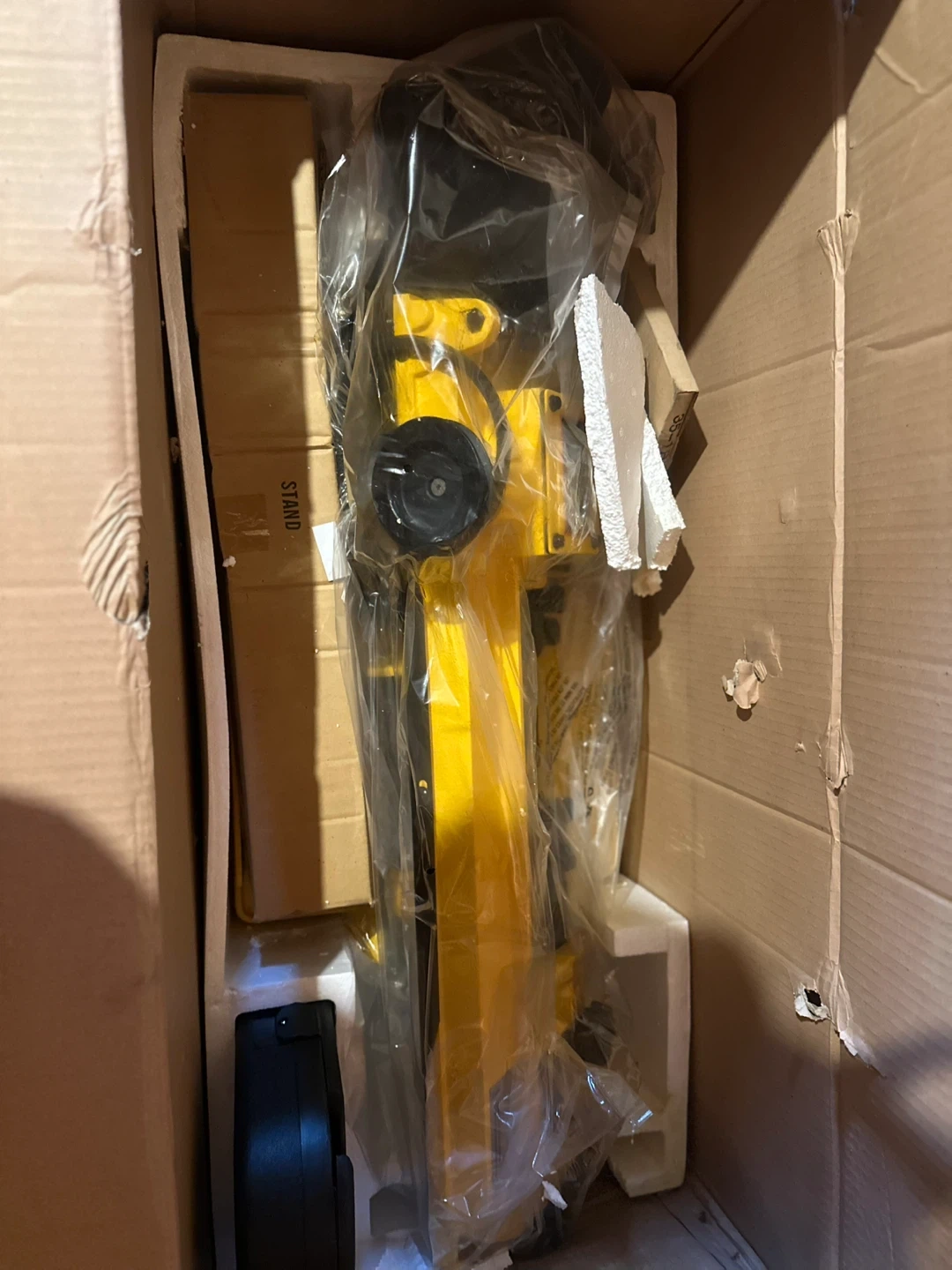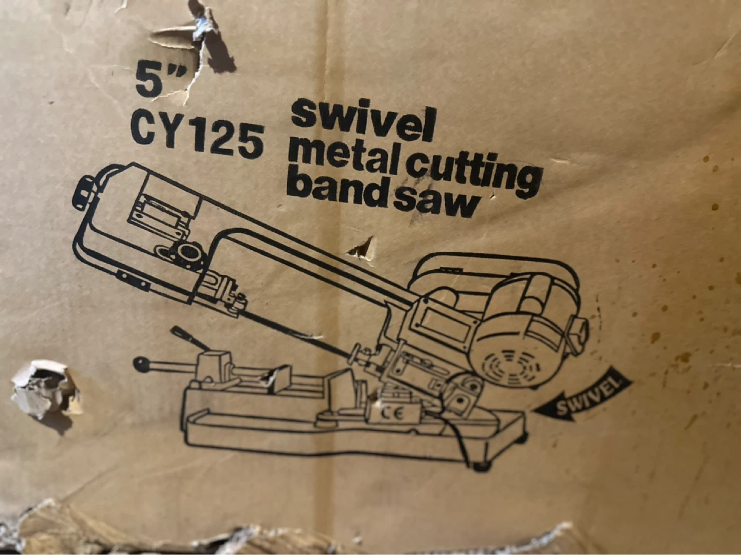 This is a 5" swivel metal cutting band saw, model CY125. It's yellow and black and comes in its original box with foam inserts. The stand is also included.