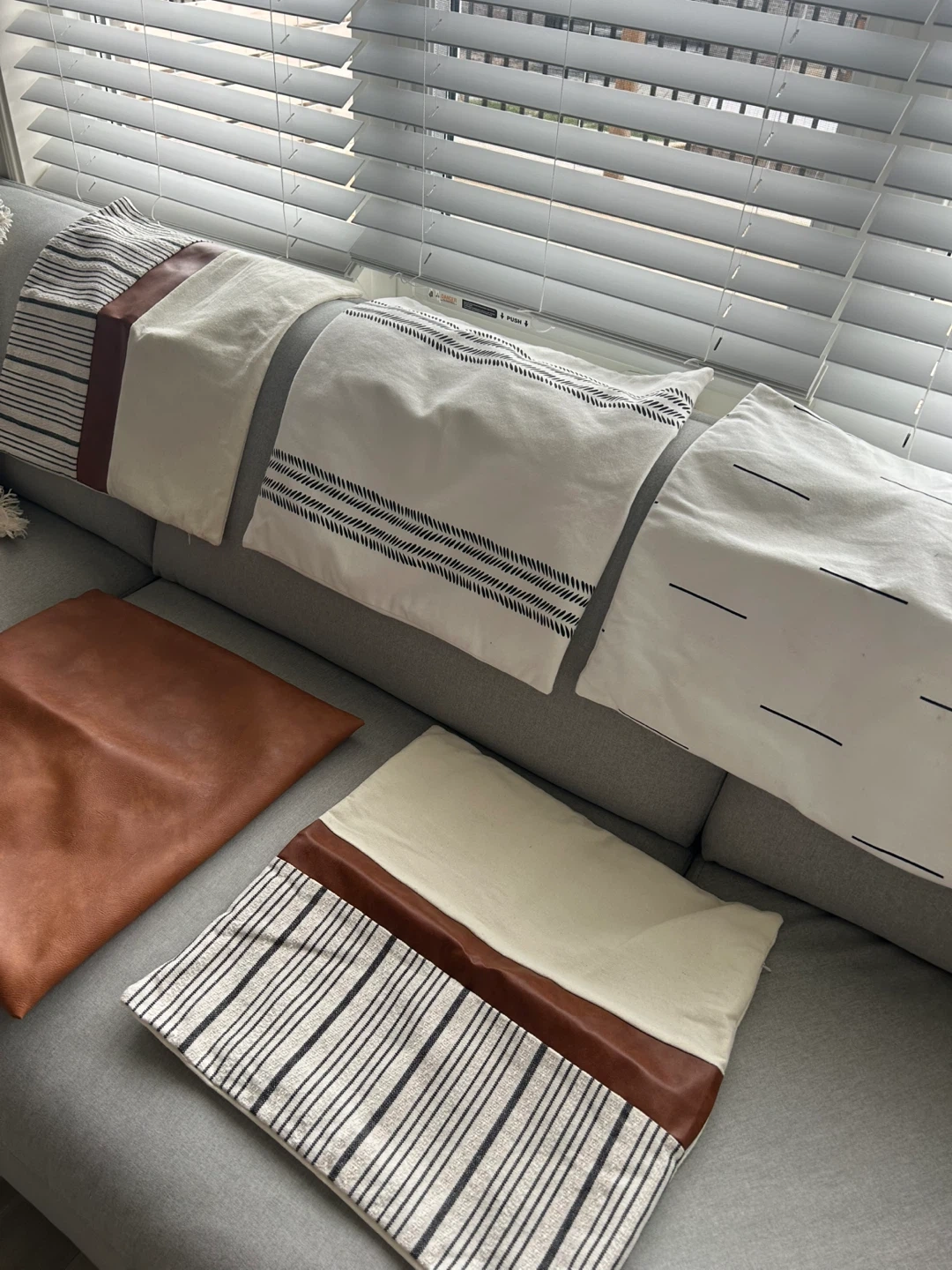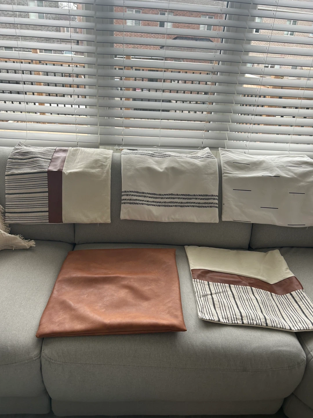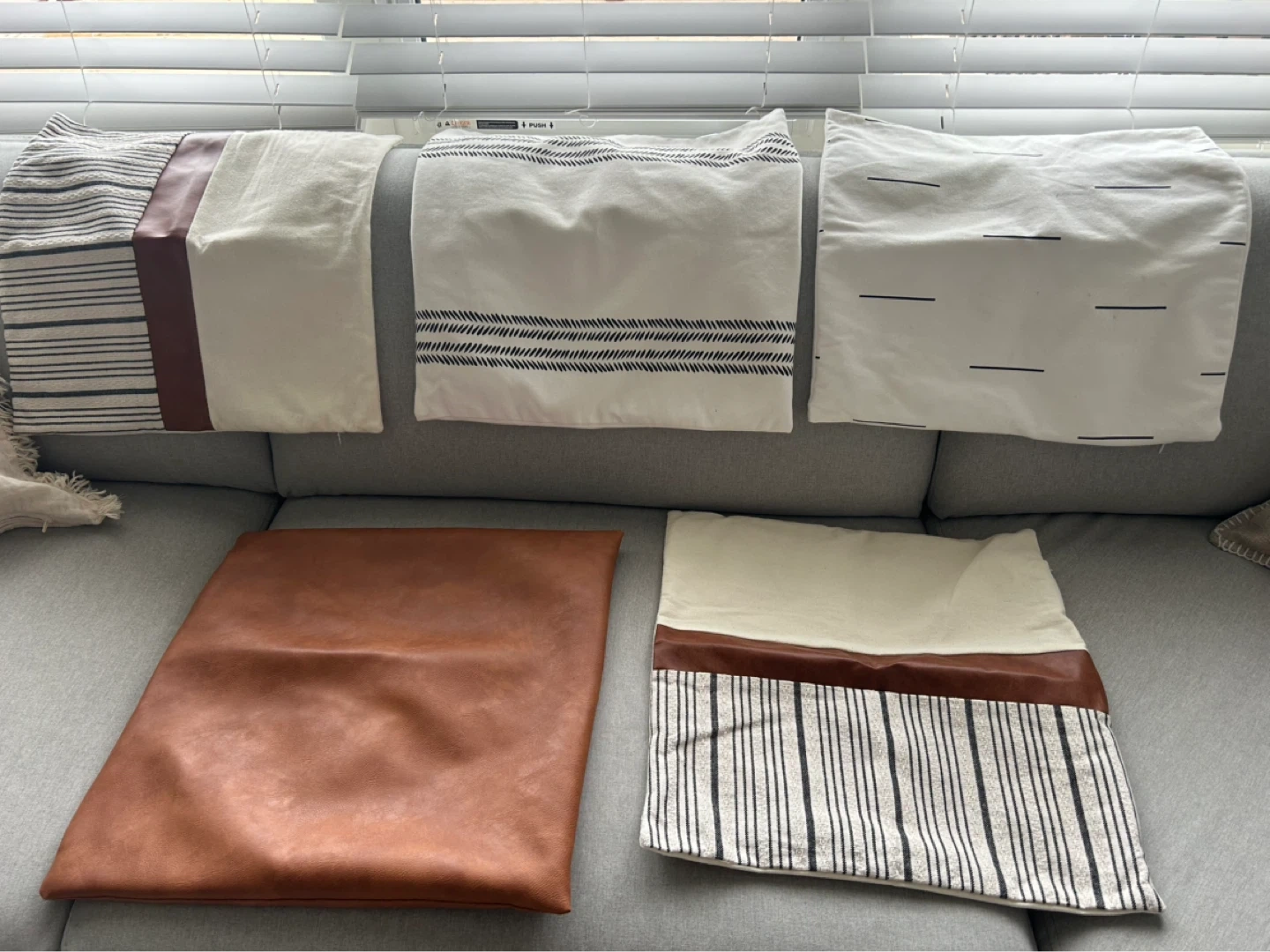 This set includes five decorative pillow covers. Three feature a cream background with black stripe patterns and faux leather accents. One is a solid tan faux leather. Another has a cream background with scattered black dash patterns. No inserts included.