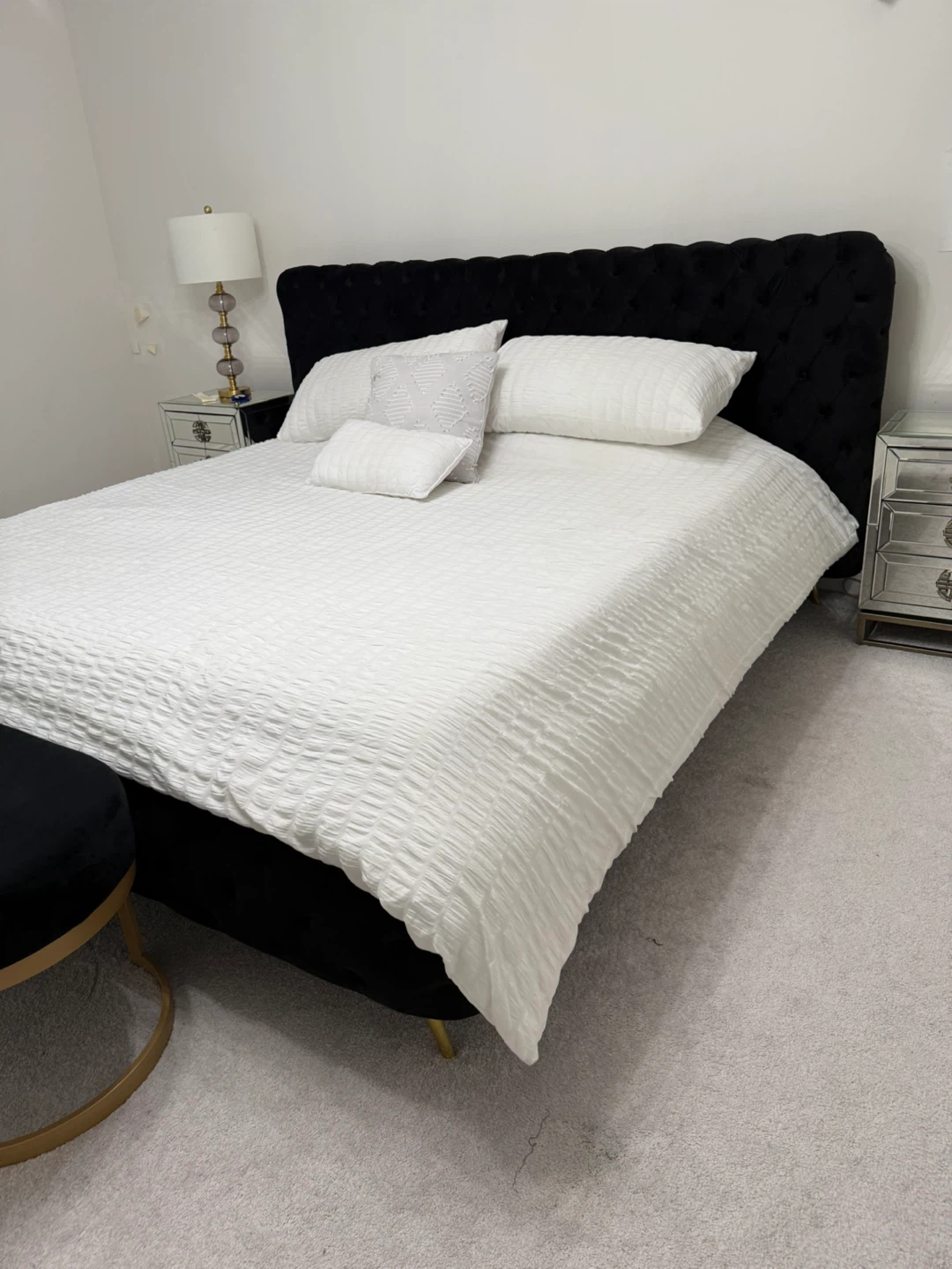 Selling a beautiful king-sized bed frame with a black velvet tufted headboard. It's in great condition and would add a touch of elegance to any bedroom!