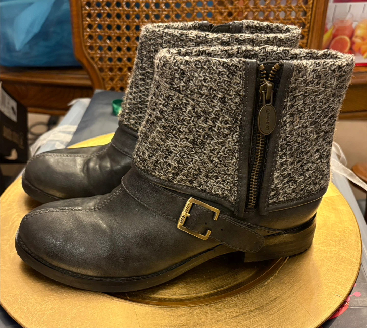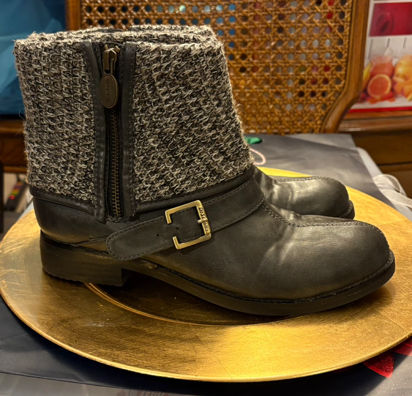 Selling a pair of Dr. Scholls ankle boots! They're a stylish mix of gray knit and leather. They feature a zip closure and buckle detail. Great for adding a bit of edge to your outfit!