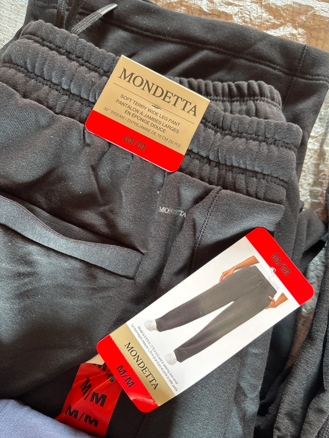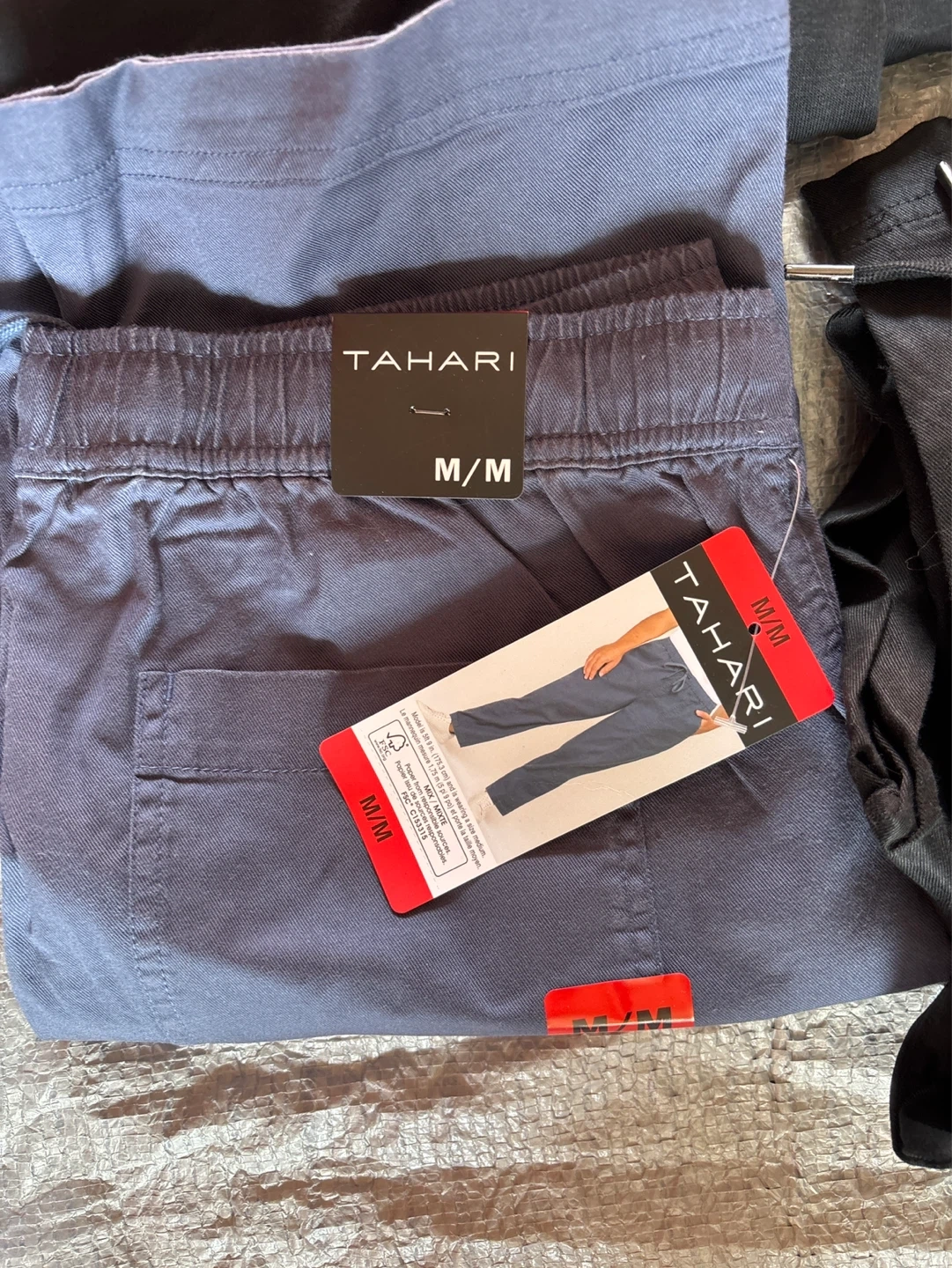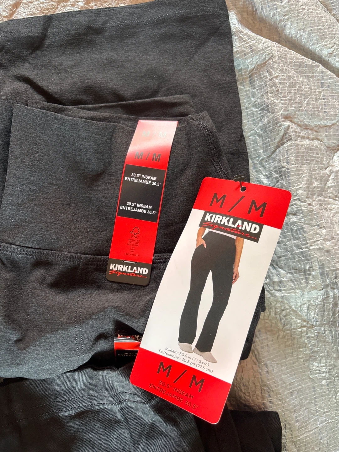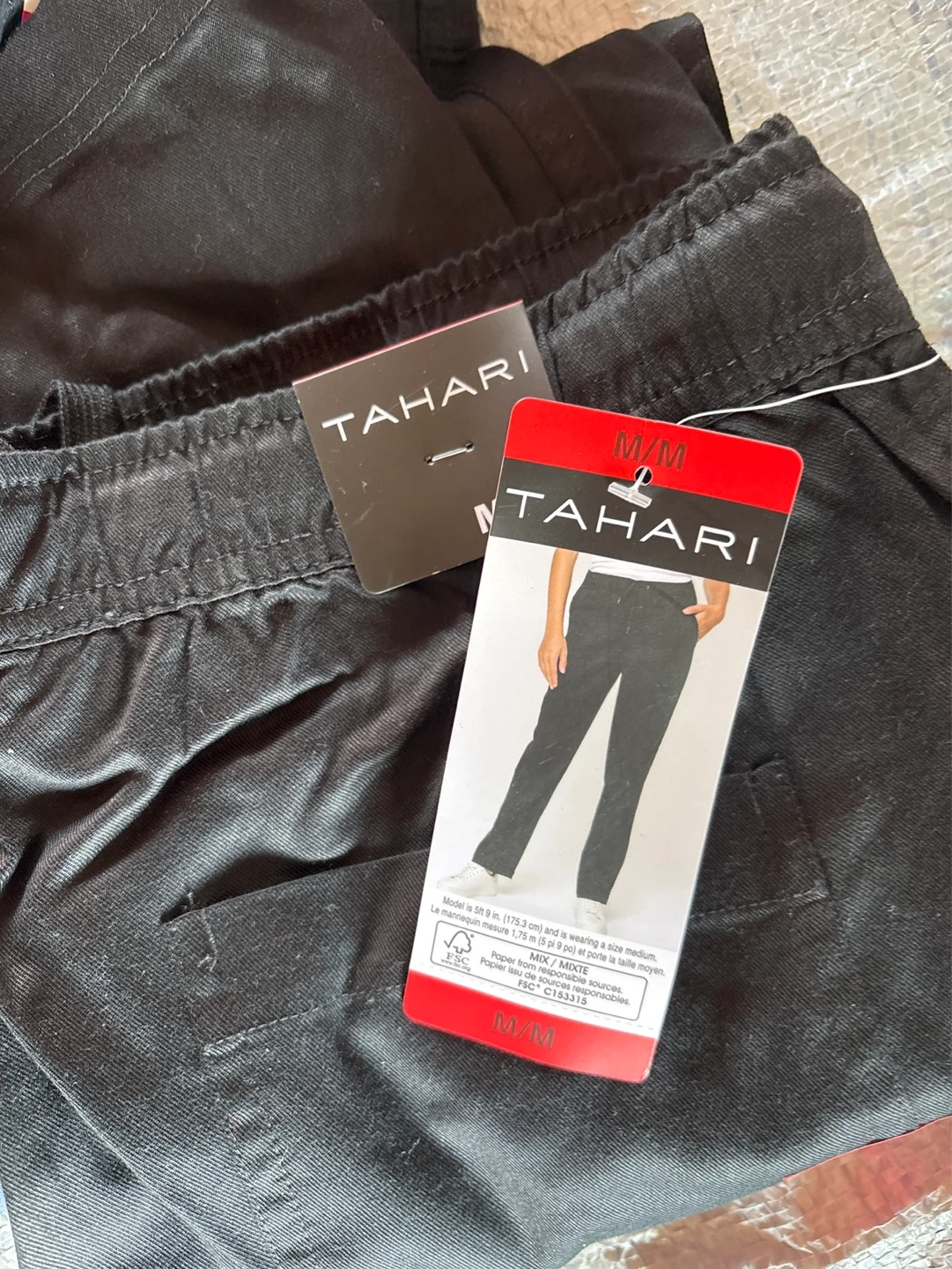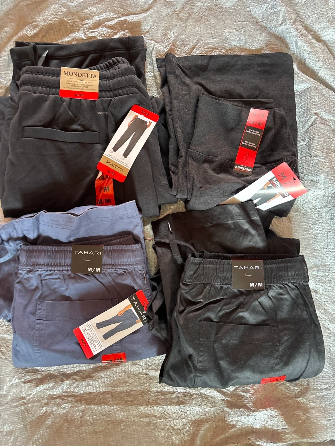 Bundle of women's pants from Mondetta, Kirkland, and Tahari. All pants are size Medium with a 30.5" inseam. Two black pairs, one heather grey pair, and one blue pair are included. Elastic waistbands on all.