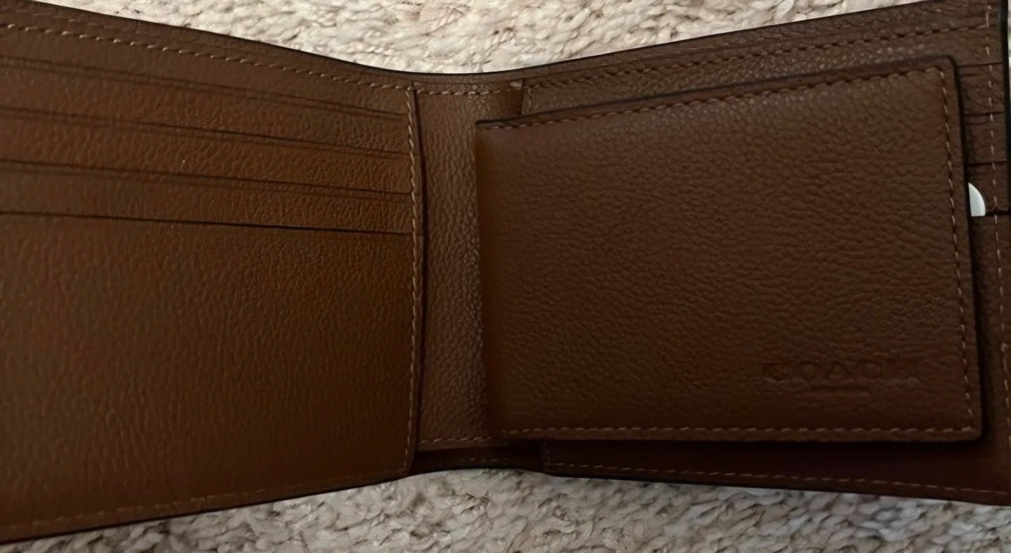 This is a brown leather bifold wallet from Coach. It has multiple card slots and a bill compartment. It's a classic wallet for everyday use.