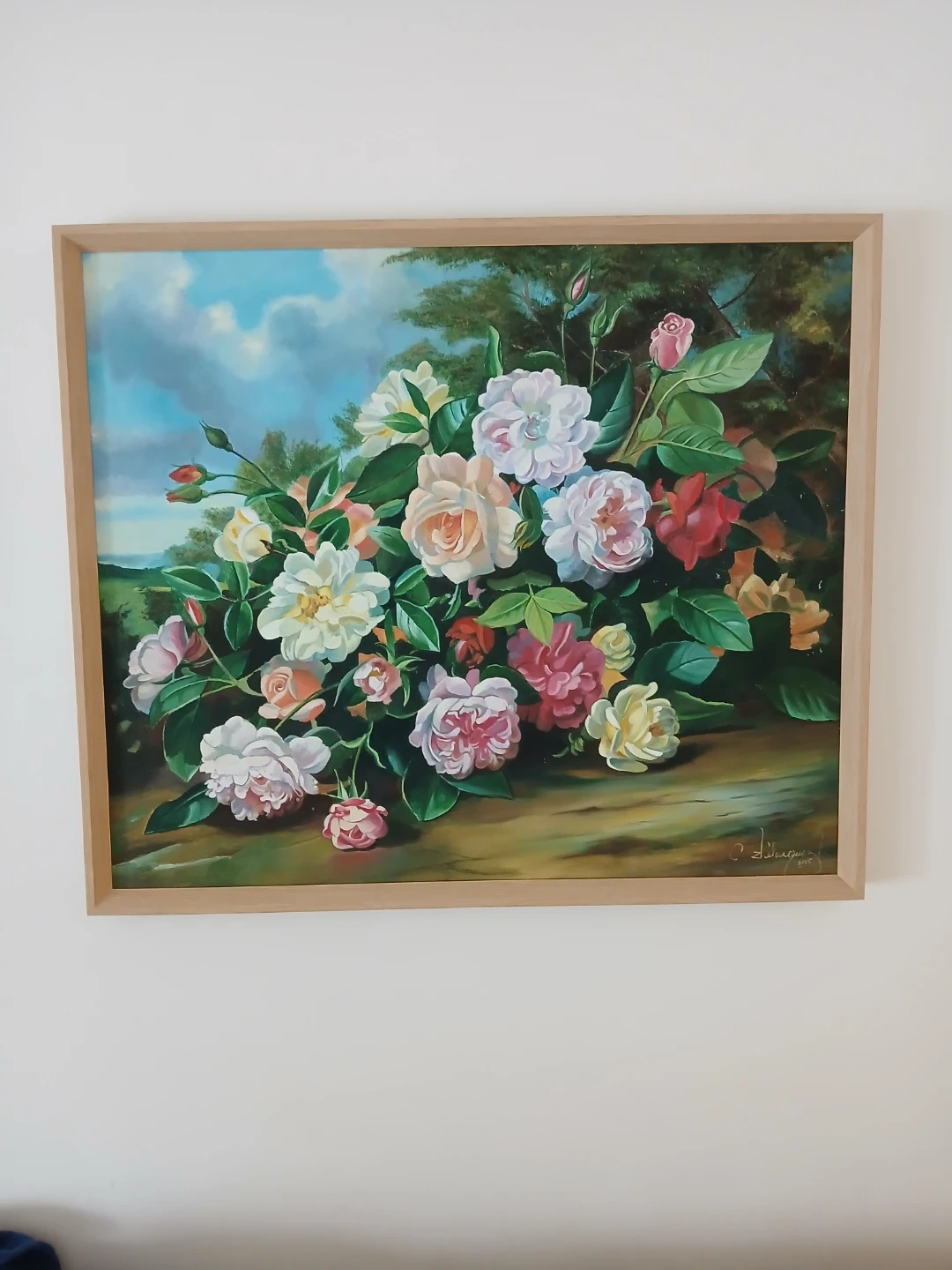 Beautiful oil painting featuring a vibrant arrangement of roses and other flowers. It's set in a simple wooden frame. This piece adds a touch of classic artistry to any room. Would look lovely in a living room or entryway.
