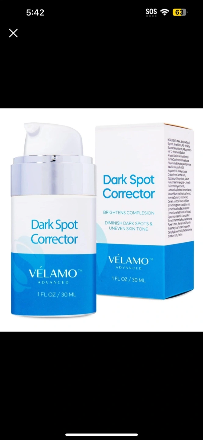 I'm selling a Velamo Dark Spot Corrector! It helps brighten complexion and diminish dark spots and uneven skin tone. The bottle contains 1 fl oz / 30 ml of product, and the ingredients are listed on the box