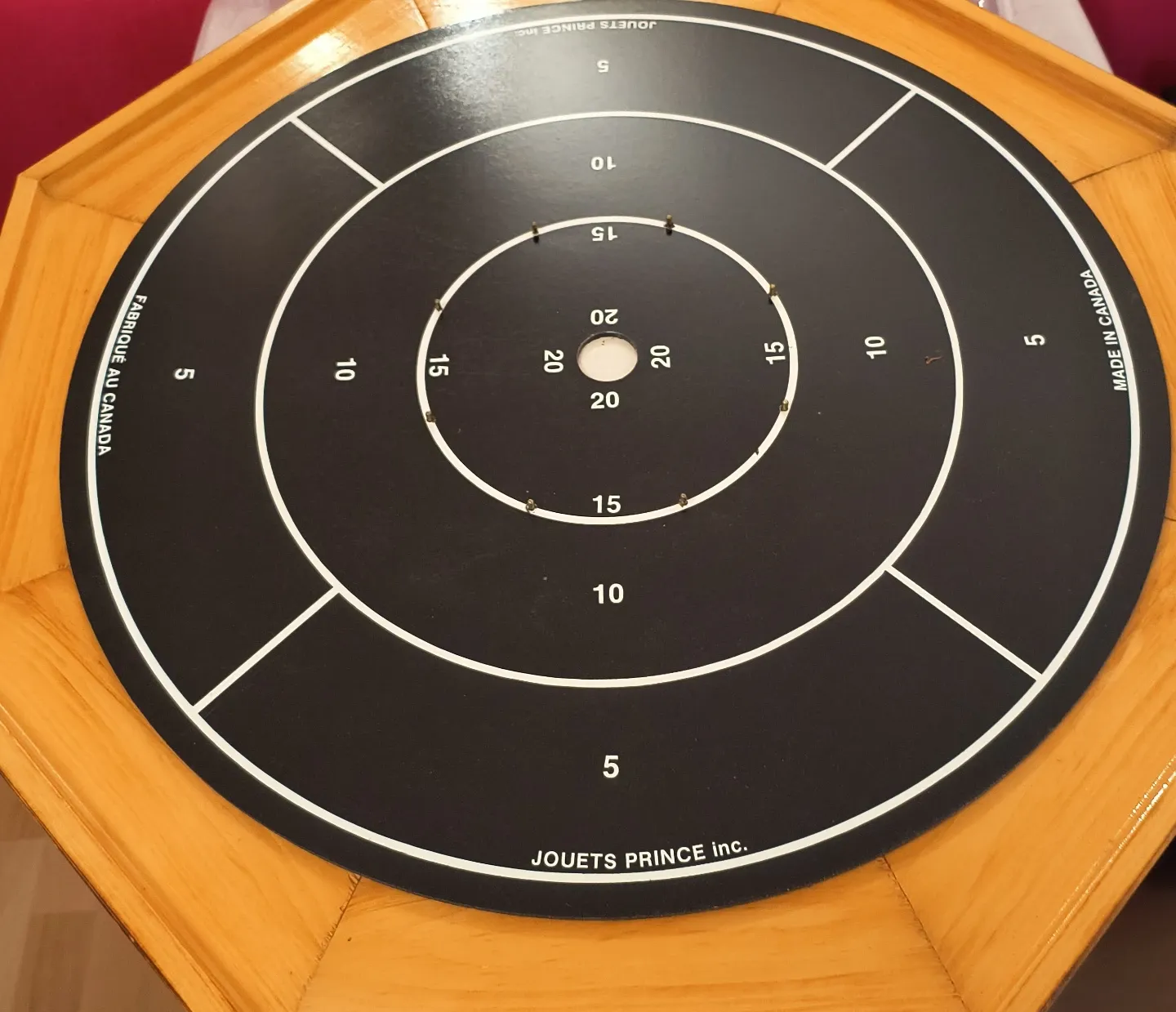 This Jouets Prince target board is made in Canada. It features concentric circles with scoring numbers up to 20. The black surface has white scoring lines.