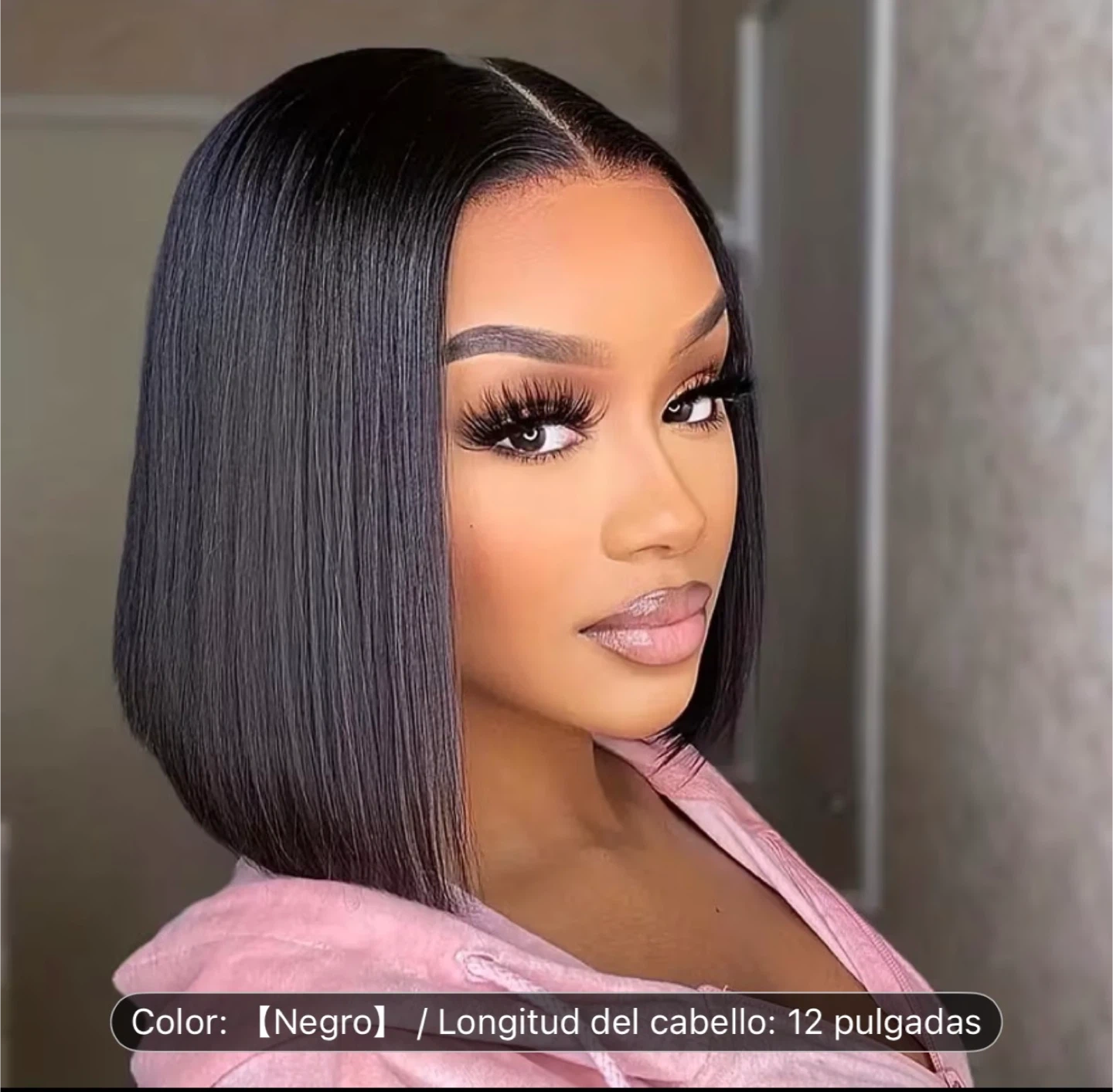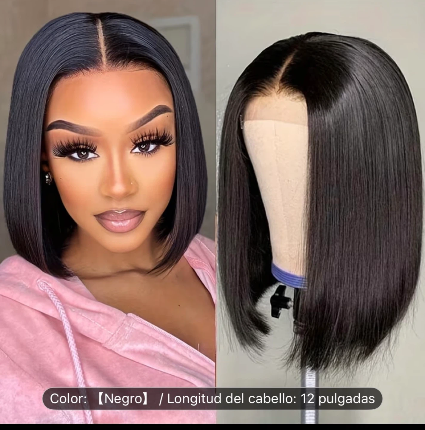This is a straight bob wig. It's 12 inches long and black in color. The wig features a lace front construction.