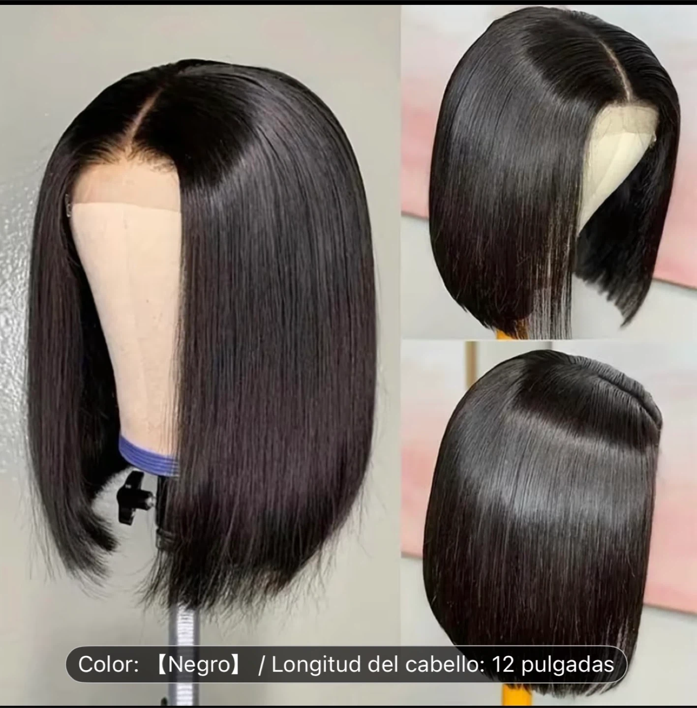 This is a straight bob wig. It's 12 inches long and black in color. The wig features a lace front construction.