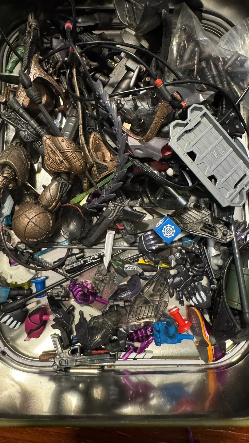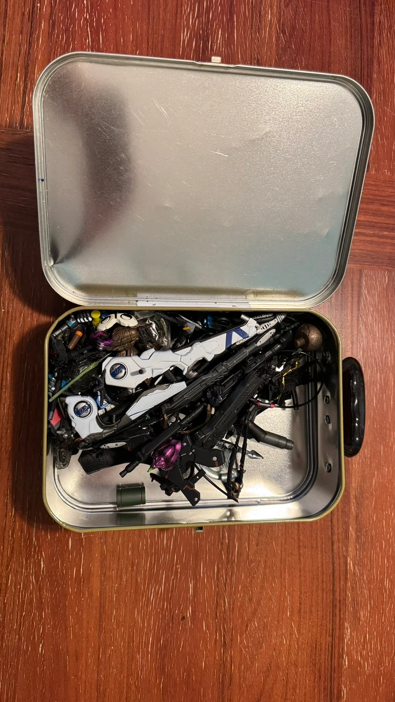 This lot includes a variety of action figure weapons and accessories, such as rifles, pistols, swords, some heads and interchangeable hands. Many pieces are from Neon Genesis Evangelion EVA figures or Todd McFarlane figures. Comes in a tin storage case.