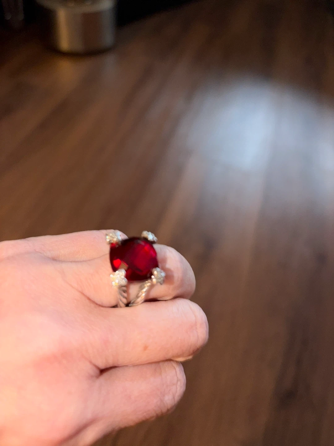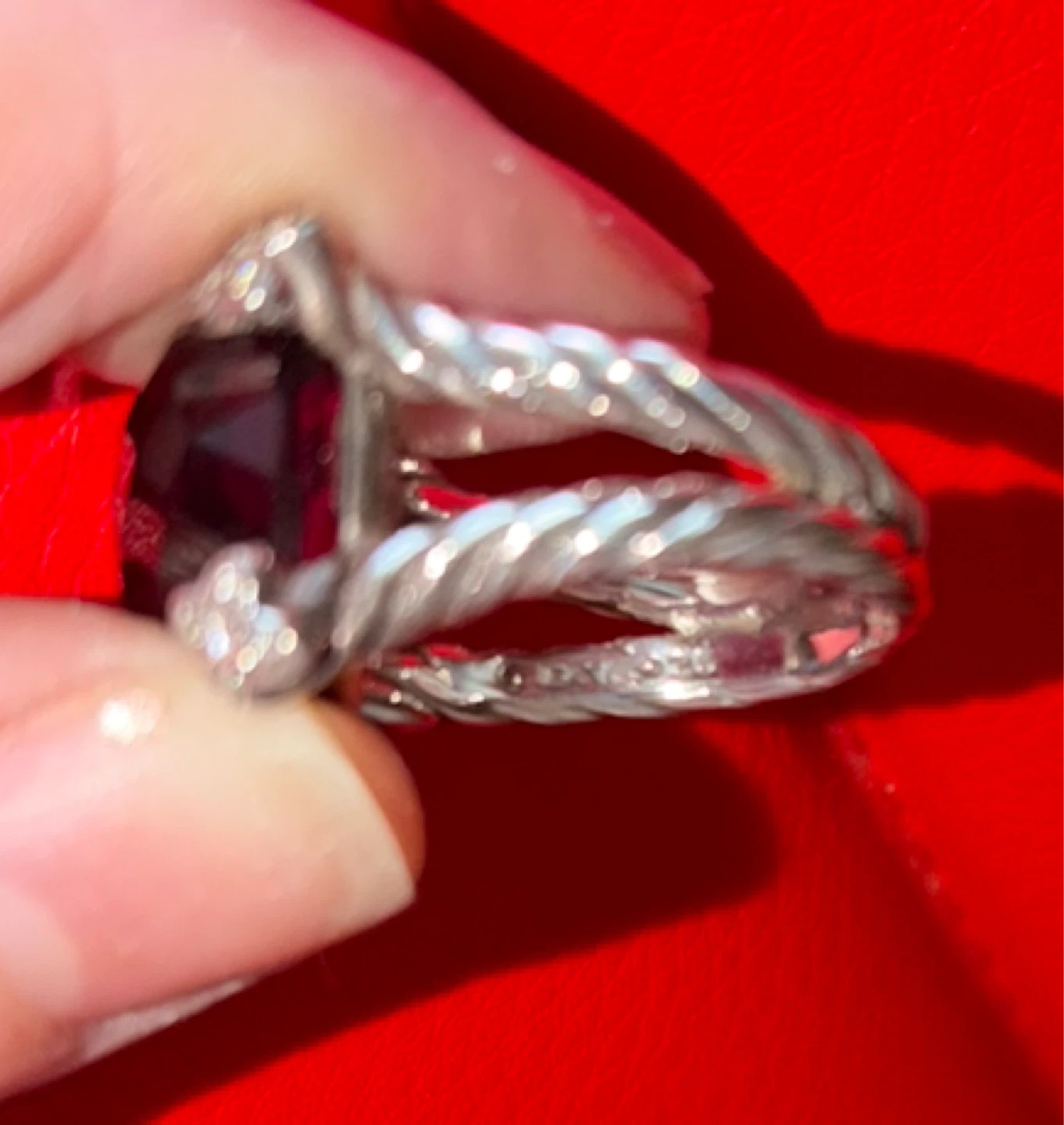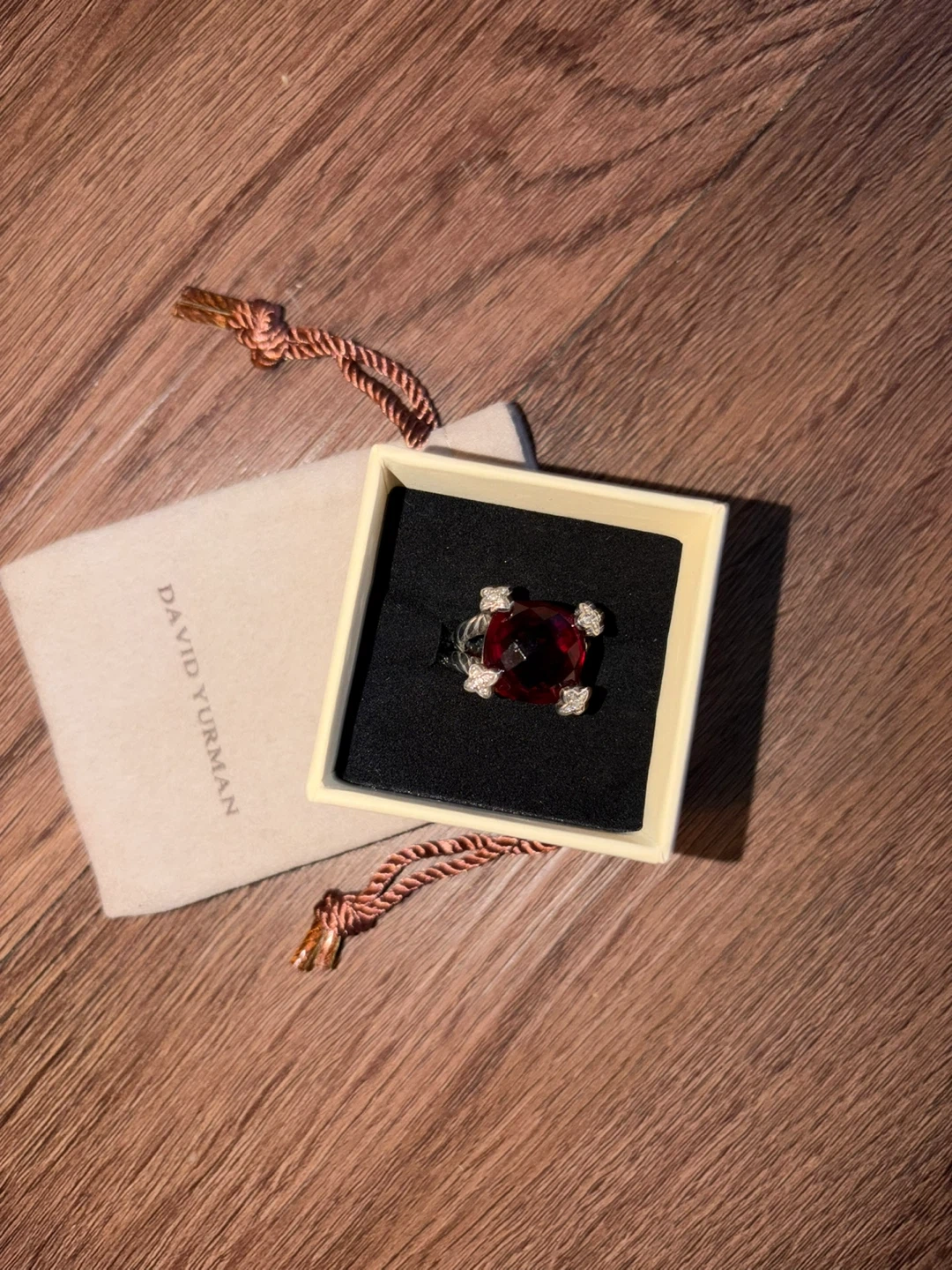 Selling a David Yurman ring featuring a beautiful red garnet. It comes with its original pouch, perfect for gifting or safekeeping. The ring is in great condition and ready for a new owner!