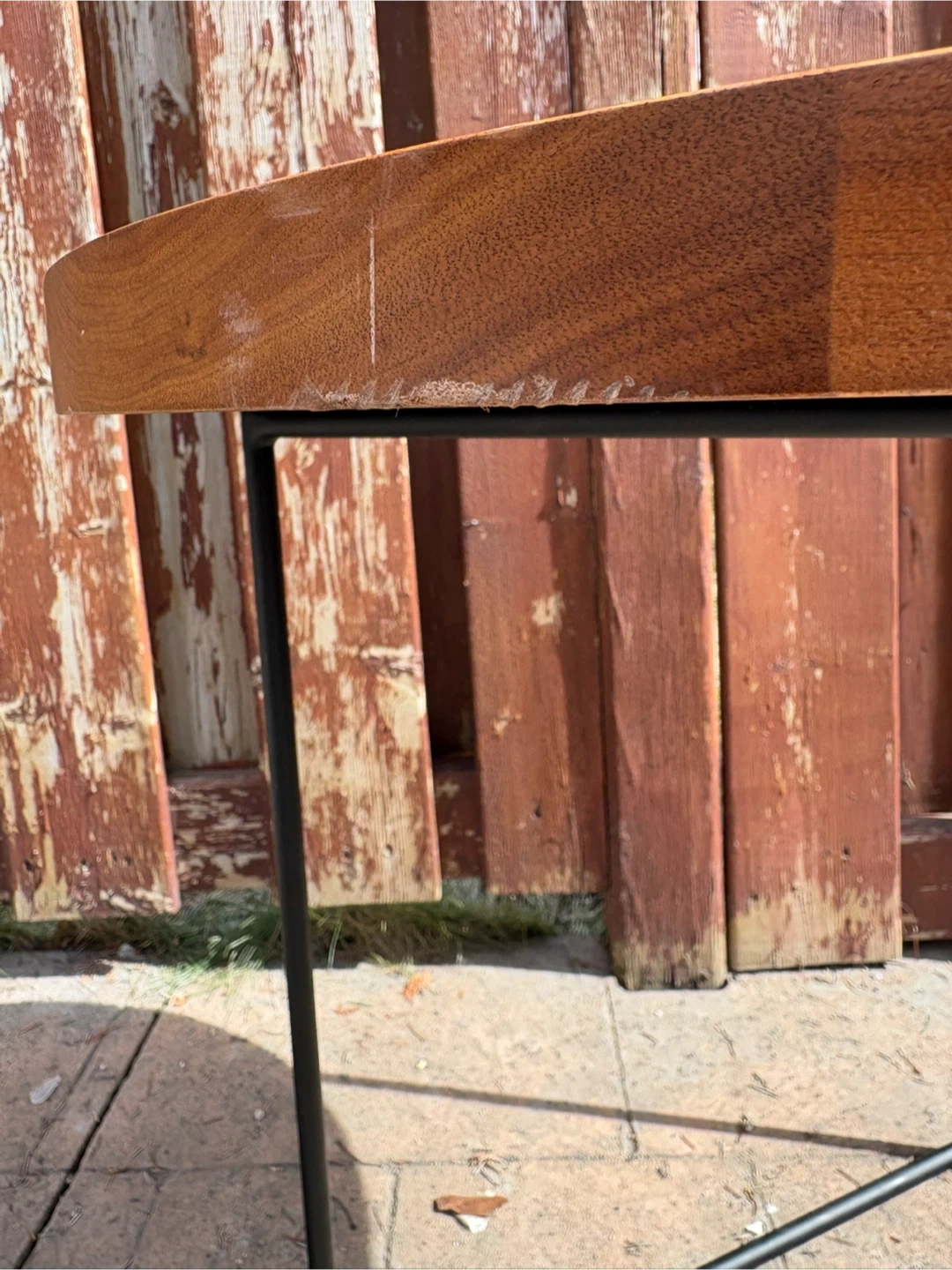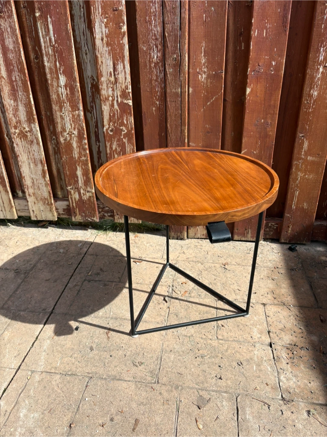 Round wooden side table with a dark metal triangular frame. This table has a warm wood finish and a raised edge. It's a sturdy accent piece for any room. Very minor wear. See pics. 21”W x 19.5”H