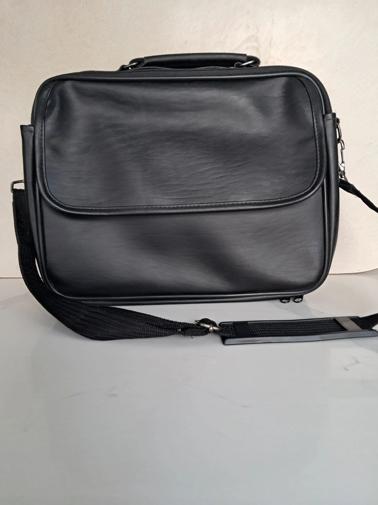 Black faux leather messenger bag. Features a top handle, adjustable shoulder strap, and zipper closure. Multiple interior compartments for organization. Ideal for laptops, documents and other accessories.