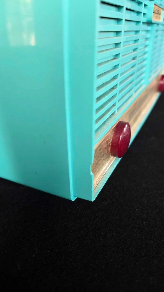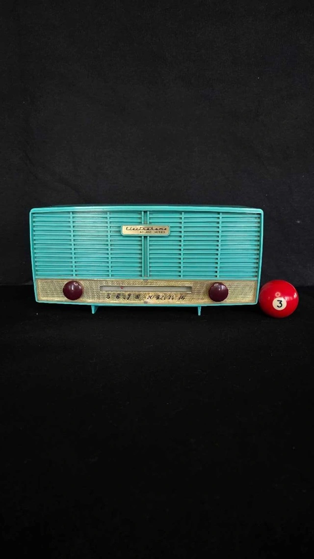 1950 Electrohome Roland Series Vintage Radio Model 5T18 in Sea Foam Green. Plastic cabinet is in great condition with a tiny chip on one edge (clearly shown in photo). The radio does turn on and faintly picks up stations, but has a humming sound (likely needs new capacitors). Pickup in Bethany, Ontario.
