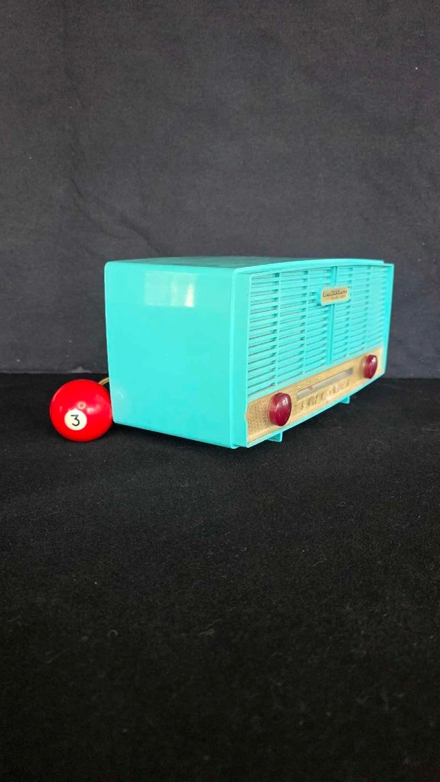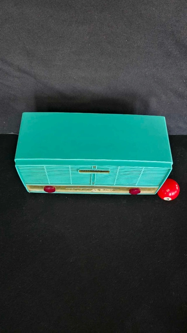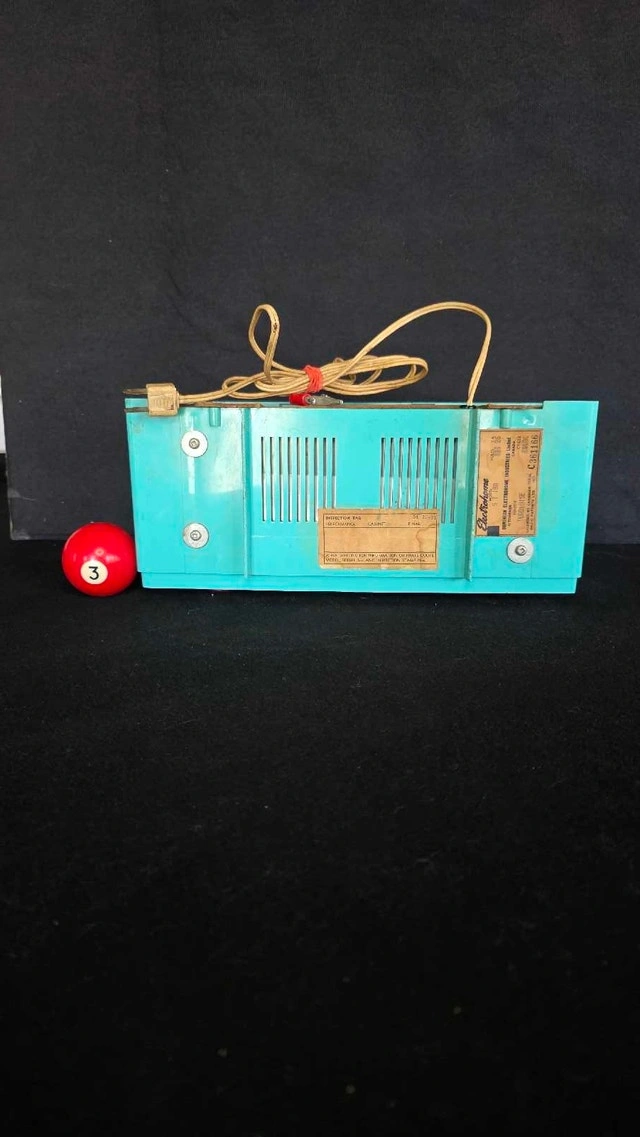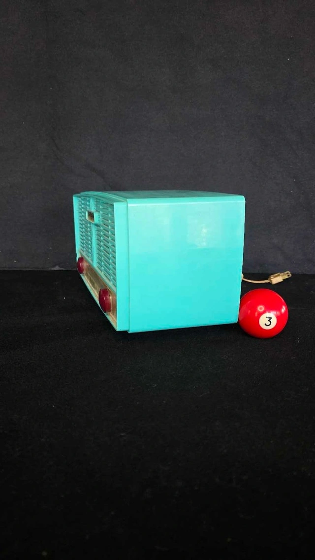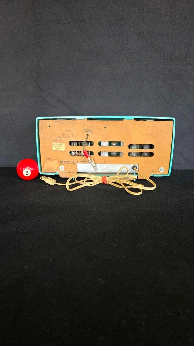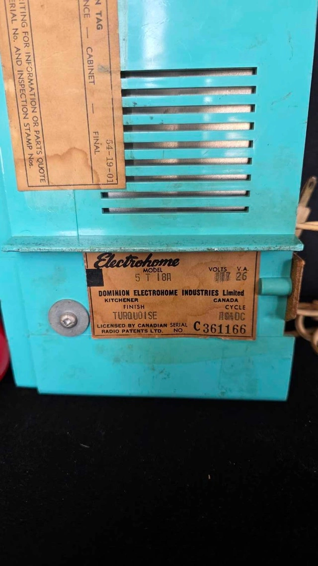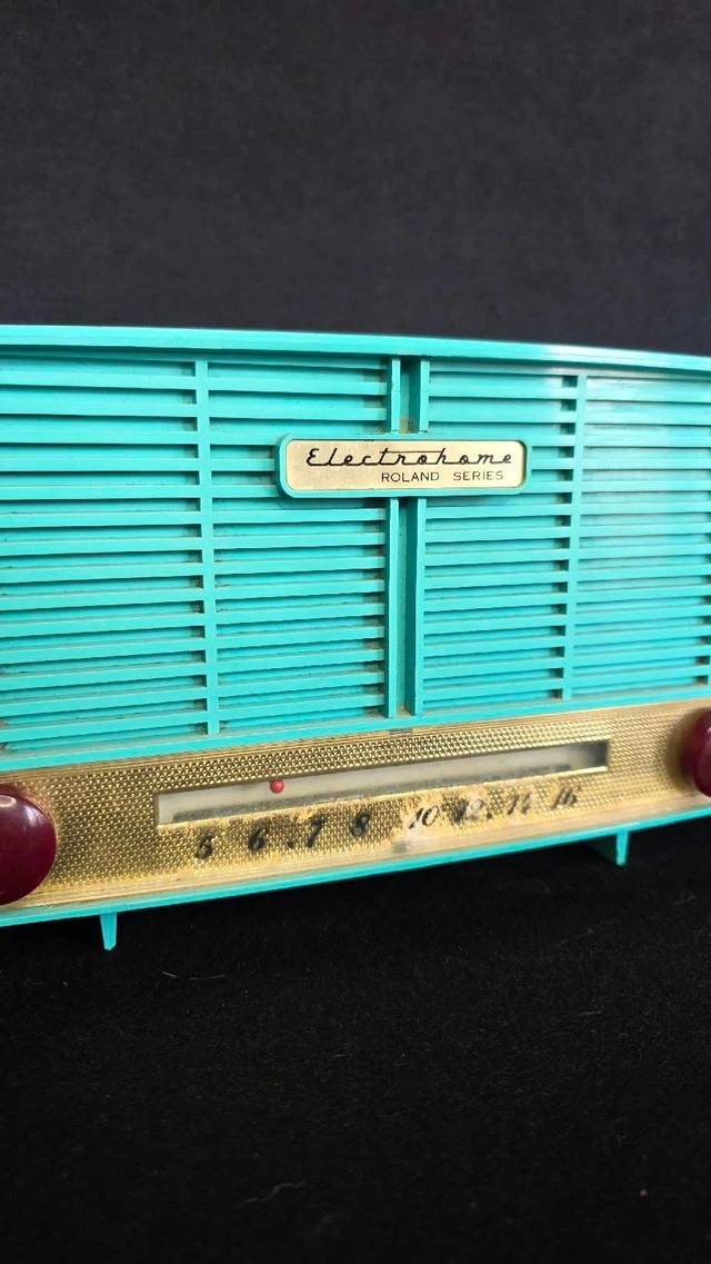 1950 Electrohome Roland Series Vintage Radio Model 5T18 in Sea Foam Green. Plastic cabinet is in great condition with a tiny chip on one edge (clearly shown in photo). The radio does turn on and faintly picks up stations, but has a humming sound (likely needs new capacitors). Pickup in Bethany, Ontario.
