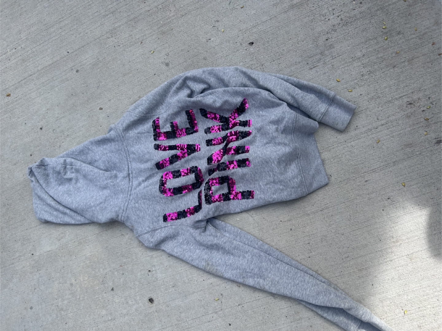 Cozy Victoria's Secret PINK grey zip-up hoodie for sale! Features a cute 'LOVE PINK' design on the back in a fun pink and black pattern.