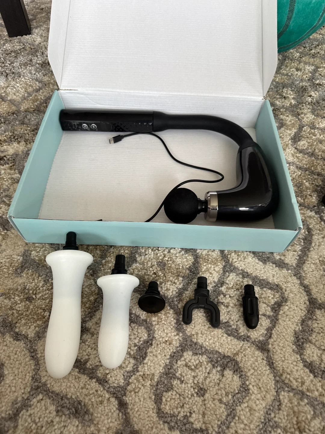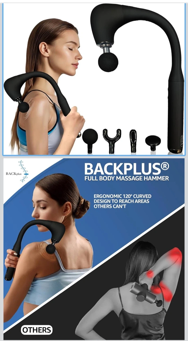 This is a BACKPLUS full body massage hammer. It's designed with an ergonomic 120-degree curve for reaching tricky spots. It comes with 4 professional massage heads and offers 9-speed intelligent variable frequency massage.