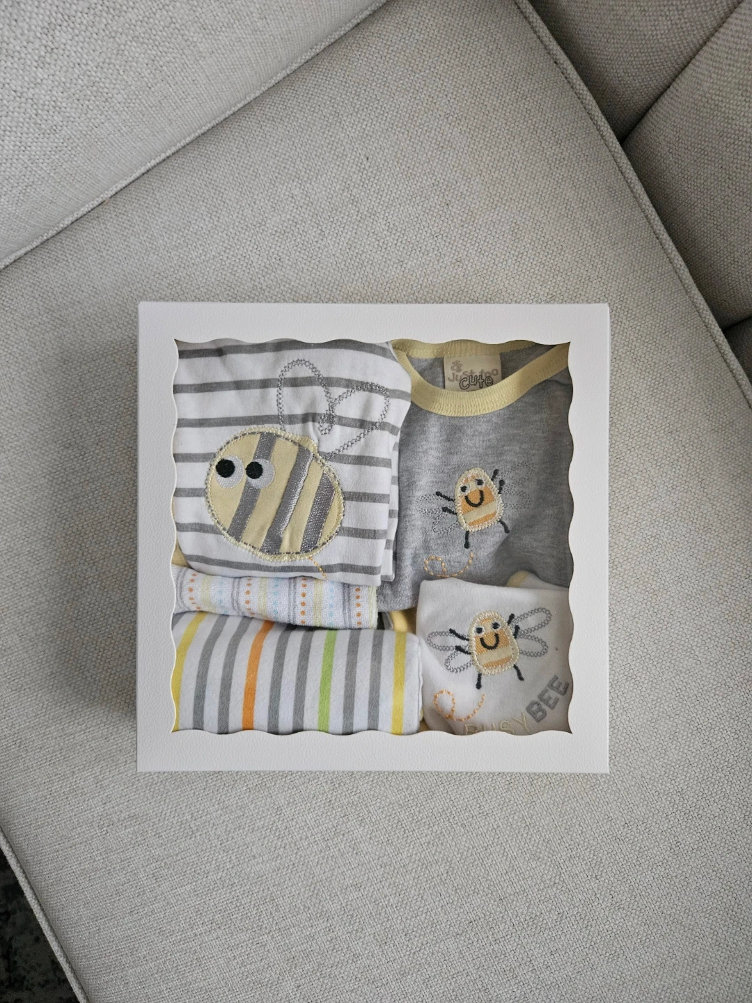 This cute baby gift set comes with a bodysuit, sleeper, hat, bib, mittens, washcloth and a receiving blanket. All pieces feature adorable bee embroidery and soft stripes. Perfect for a new arrival!