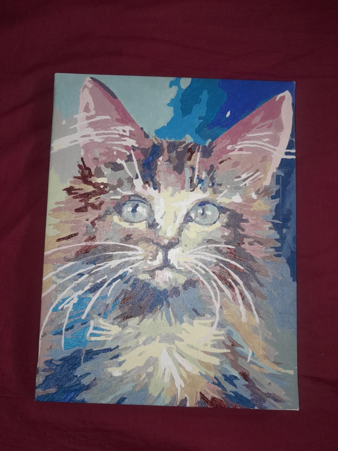 This is a finished canvas handmade painting depicting a fluffy cat with bright blue eyes. The artwork is stretched over a wooden frame. It's ready to hang or be displayed as is. Makes a nice addition to any cat lover's collection!