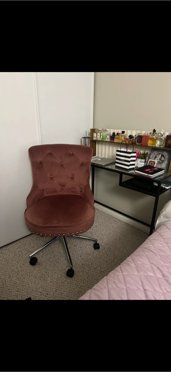 Glass table with black frame, Charming rose gold velvet office chair with tufted detailing and silver nailhead trim. It features a five-star base with casters for easy mobility. This chair's upholstered back and seat provide comfort for extended use.