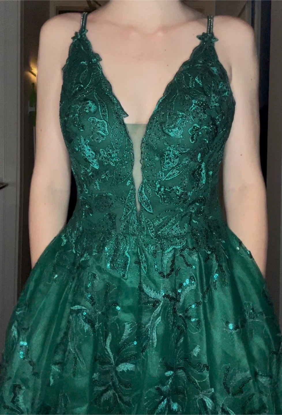 Beautiful green prom dress by Ellie Wilde. It has pockets and is a size 4. Initially bought for $850. Worn once 2 years ago and has been altered to fit very high heels, around 5’8ish total in height. Price is slightly negotiable.