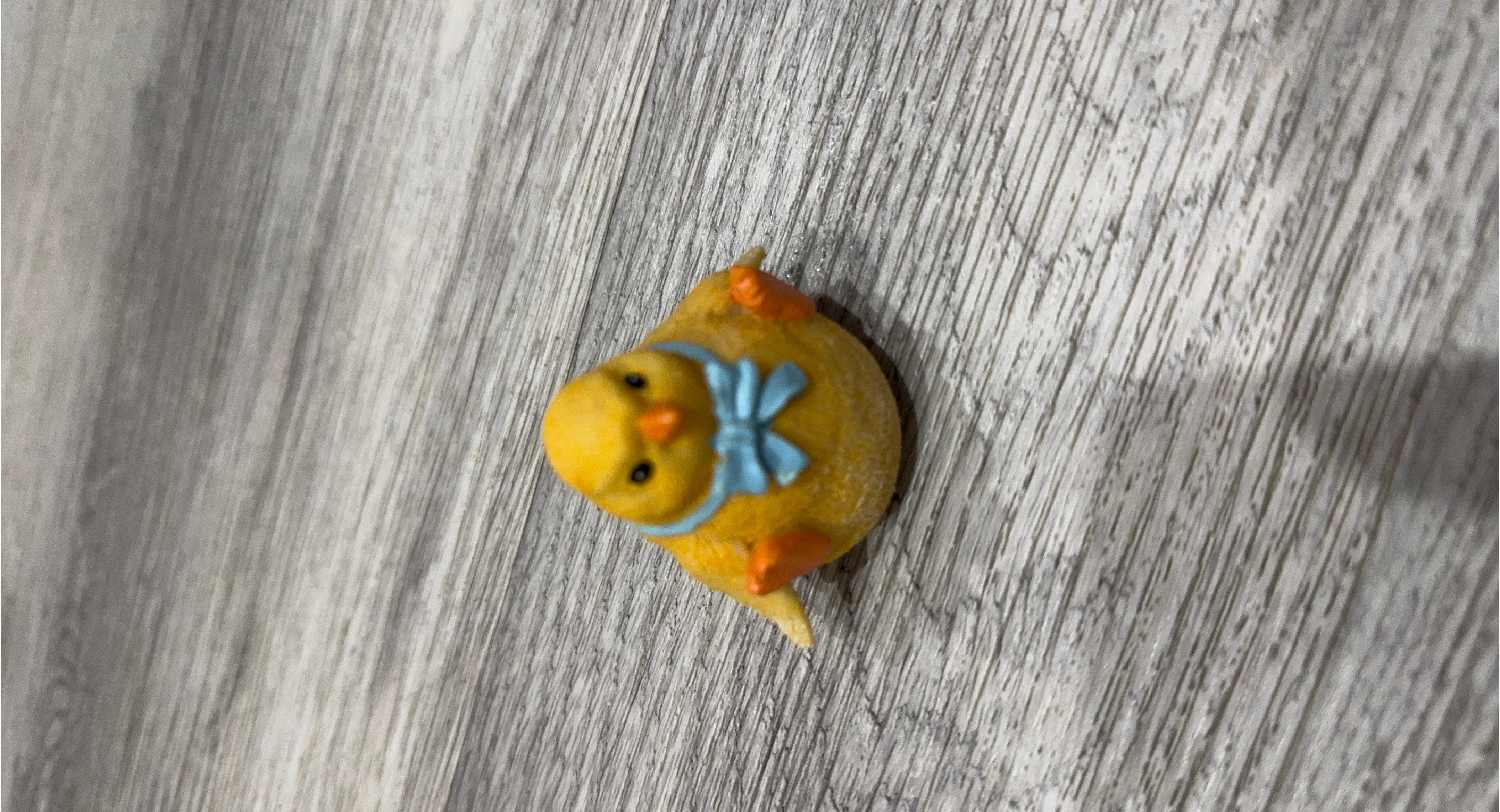 A cute yellow chick figurine, perfect for Easter decorations. It's wearing a small blue bow around its neck. This little chick is great for adding a festive touch to your home or a desk!