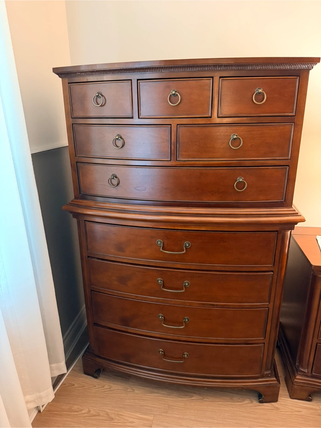 Beautiful brown wooden dresser featuring a total of eleven drawers for ample storage. It has a classic design with ring pulls on the upper drawers and curved handles on the lower ones. This dresser offers plenty of space to organize your clothes and belongings.
