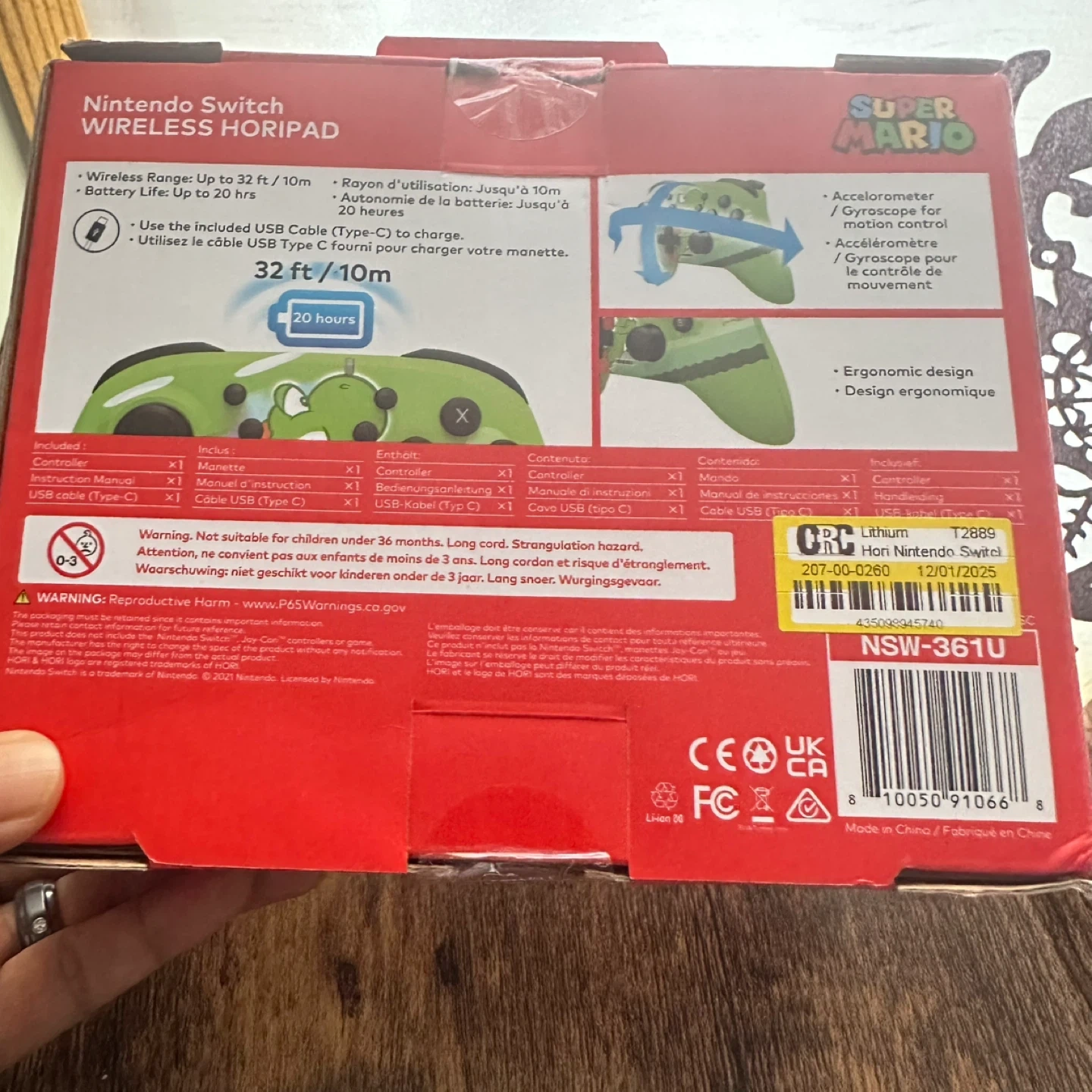 This HORIPAD controller connects wirelessly to your Nintendo Switch. Battery life is up to 20 hours of playtime. It's ergonomically designed for comfort. Includes USB cable for charging.