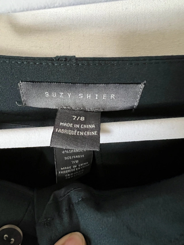 Suzy Shier dress pants in size 7/8, offering a sleek and professional look for any occasion. Specifications: * Brand: Suzy Shier * Size: 7/8 * Colour: Dark Green * Material: 96% Polyester, 4% Spandex