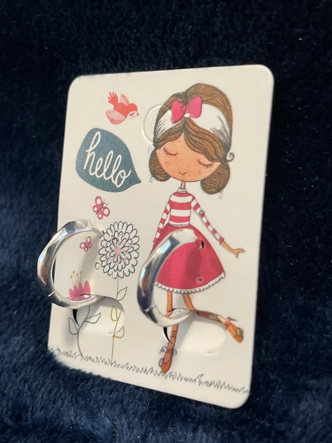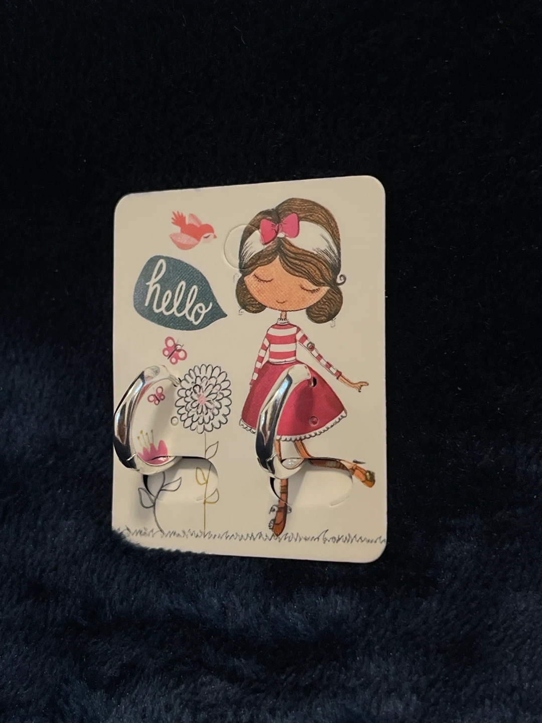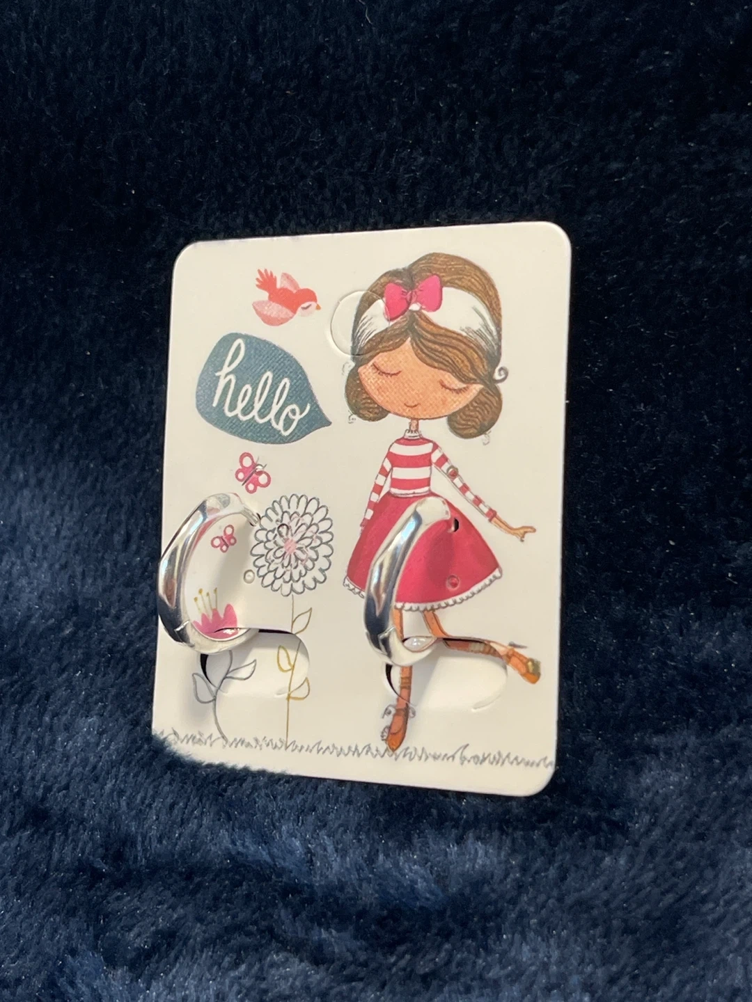 These cute silver earrings are brand new and still on their original display card! They feature a sweet design with a little girl and a 'hello' speech bubble. Perfect for a young girl who loves to accessorize