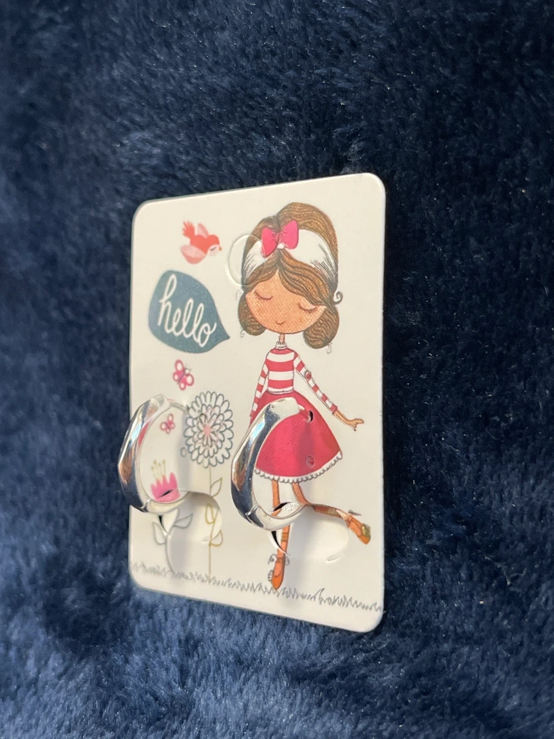 These cute silver earrings are brand new and still on their original display card! They feature a sweet design with a little girl and a 'hello' speech bubble. Perfect for a young girl who loves to accessorize
