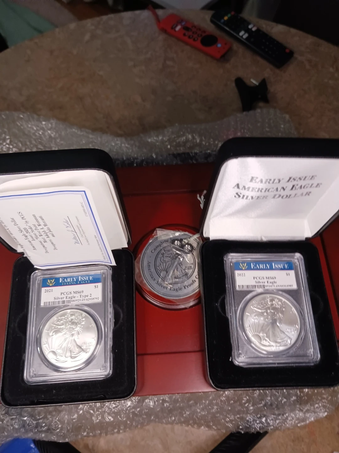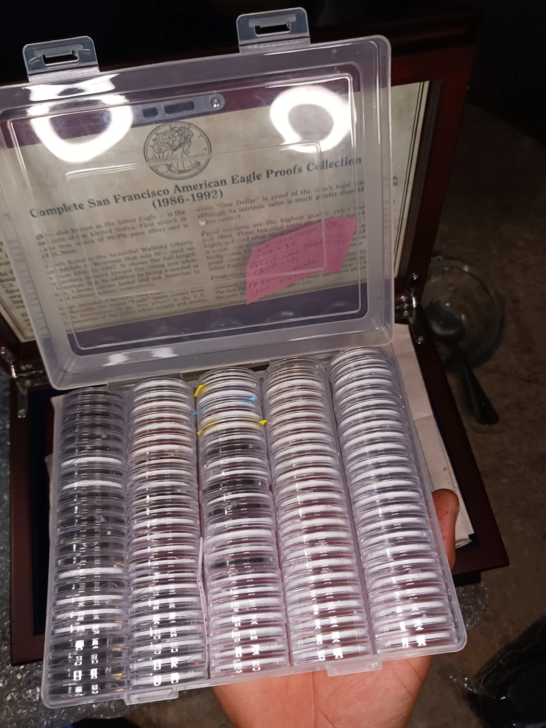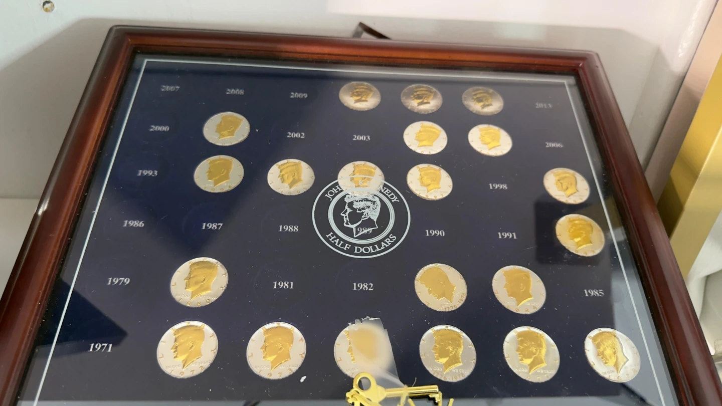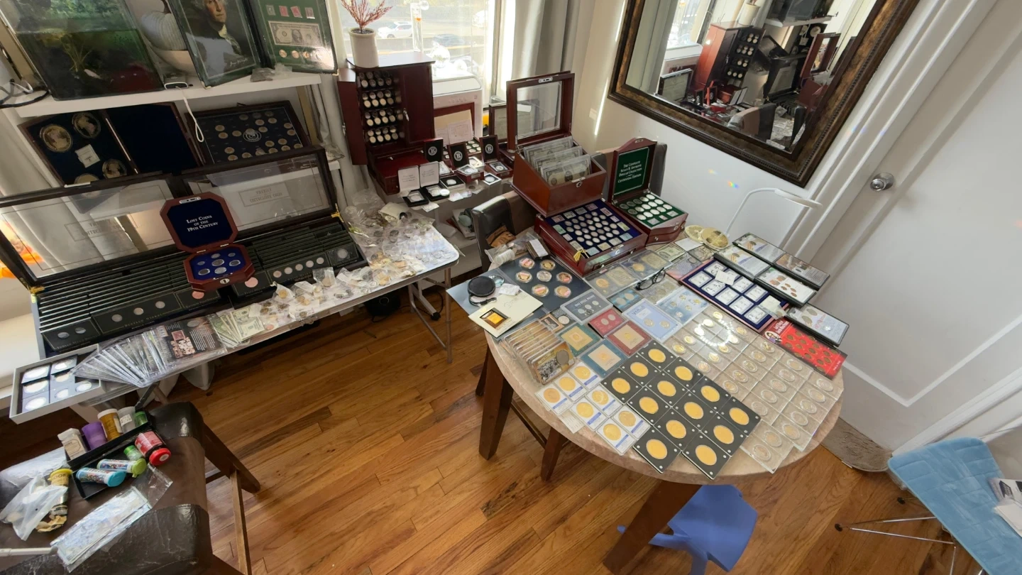 Extensive collection featuring various US coins, including silver nickels and proof dollars. Also includes historical banknotes and mint sets. Many items are encapsulated or in display cases.