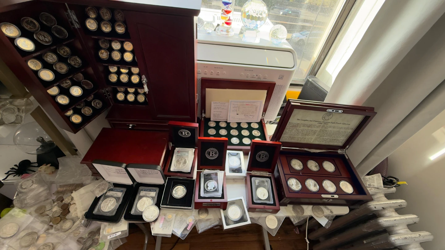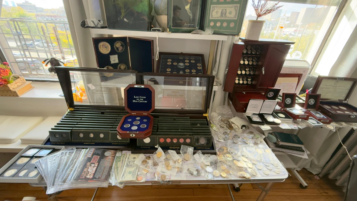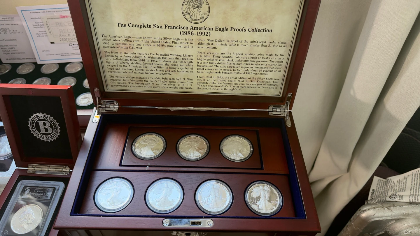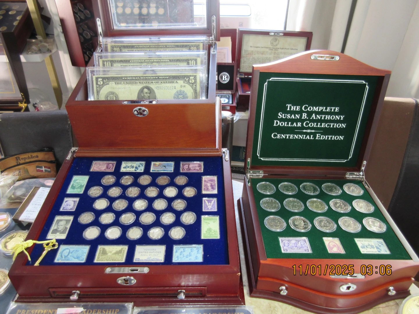 Extensive collection featuring various US coins, including silver nickels and proof dollars. Also includes historical banknotes and mint sets. Many items are encapsulated or in display cases.